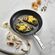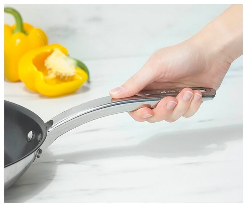 Ручка термоизолированная, дополнена петлей для подвешивания на рейлинг, что обеспечивает компактность хранения. Сковорода поставляется без крышки, которая приобретается отдельно. Для очистки применяют влажную ткань или губку. Допускается обработка в посудомоечной машине. Корпус изготовлен из нержавеющей стали. Цвет — серебристый. Вес — 1,225 кг.