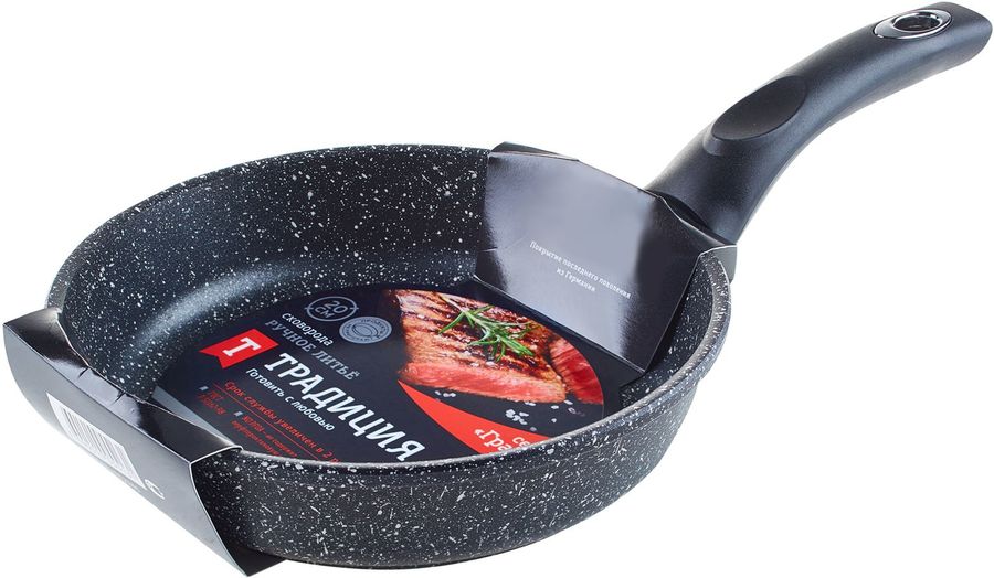 Особенности Сковорода ТМ Традиция не содержит никеля, тяжелых металлов и ПФОА, обладает хорошей антипригарностью для легкого приготовления здоровых блюд без масла и жира. Толщина дна 6,0 мм, толщина стенок 3,8 мм. Высота борта 5 см. Подходит для любых видов плит, кроме индукционной.