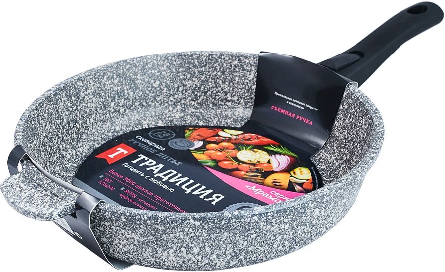 Литая сковорода со съемной ручкой и мраморным покрытием ТМ Традиция предназначена для ежедневного использования в домашних условиях. Прочное и долговечное антипригарное покрытие на водной основе разработано специально для данной линейки. Два слоя дополнительной защиты от пригорания.