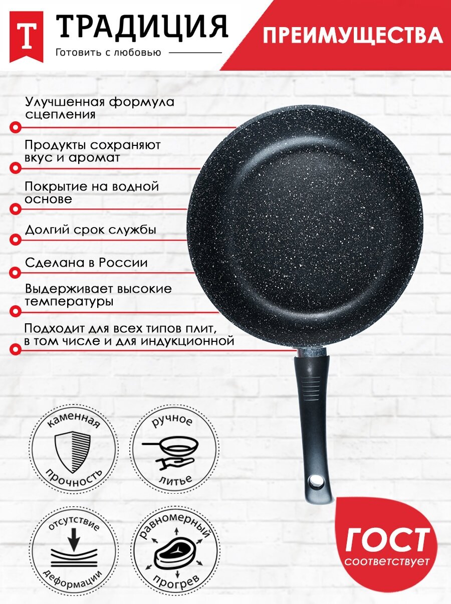 Литая посуда с антипригарным покрытием ТМ "Традиция готовить с любовью" отлично подойдет для жарки мяса или рыбы, тушения овощей, пассировки, приготовления жаркого и других блюд. Пища на такой посуде точно не пригорит и не прилипнет, приготовится быстро и равномерно, покроется аппетитной корочкой. Посуда изготовлена из литого алюминия высочайшего качества — материал отличается высокой прочностью, легок в эксплуатации. Литой корпус не деформируется при нагреве, утолщенное дно гарантирует прочность и долговечность посуды. Антипригарное покрытие не изменяет вкус и запах пищи, препятствует ее пригоранию. Оно позволяет готовить с меньшим количеством масла/жира, что делает готовое блюдо менее калорийным. Покрытие не содержит PFOA. Рукоятка soft touch не скользит и не нагревается, имеет эргономичную форму и удобно лежит в ладони. В ней предусмотрено отверстие для подвеса. Сковорода подходит для всех типов бытовых плит, в том числе и индукционных. Со сковородой от бренда «Традиция» Вы сможете воплотить в реальность любые понравившиеся рецепты и порадовать домашних вкуснейшими блюдами.