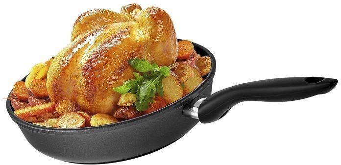 Сковорода литая, классический корпус, толщина дна 6 мм, бортов 4,5 мм, высокие прямые борта. Покрытое дно термостойким силиконом "Защита 360" облегчает уход. Антипригарное покрытие Xylan с двойным усилением армировано смесью частиц высокой прочности и обладает отличной абразивной износоустойчивостью