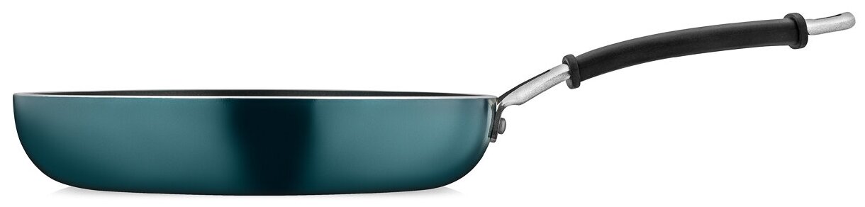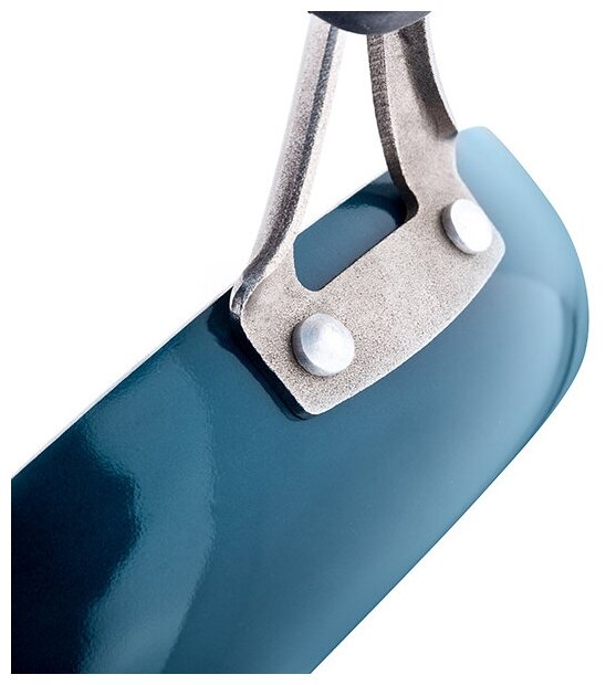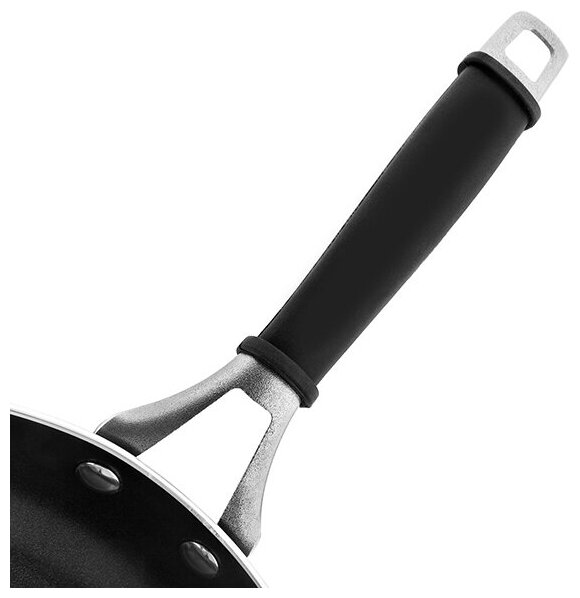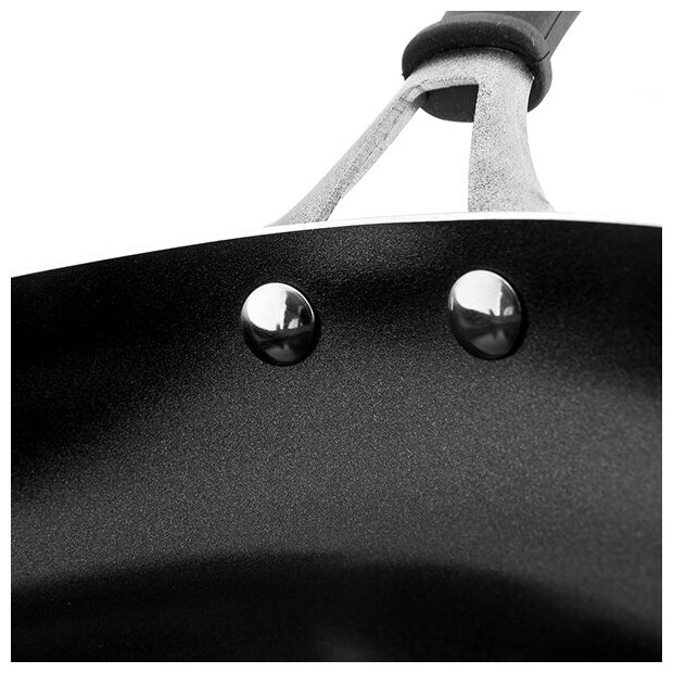 Изготовлена из нержавеющей стали с зернистой обработкой поверхности, а так же из силикона. Сковороду можно использовать в духовке. Надежное клепочное крепление