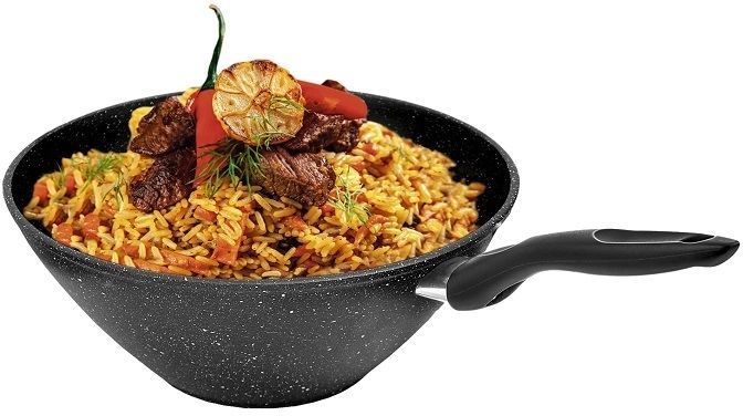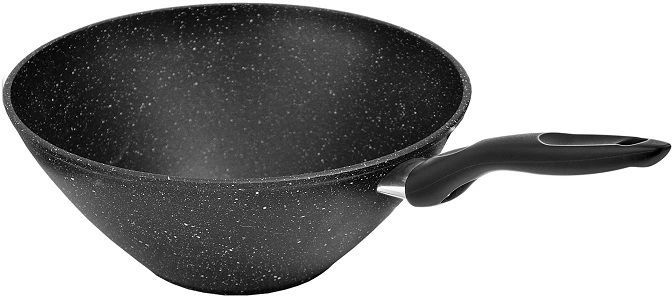Сковорода литая, толщина дна 4 мм, бортов 2,5 мм, высокие борта 115 мм. Каменное покрытие-черный гранит. Антипригарное покрытие Quantum2 с двойным усилением армировано смесью частиц высокой прочности и обладает отличной абразивной износоустойчивостью.