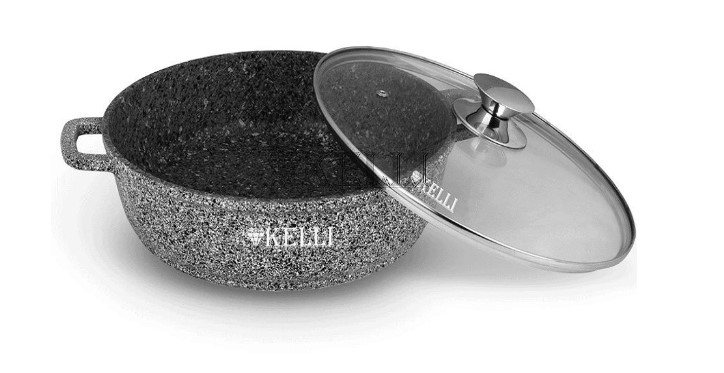 Сковорода-сотейник выполнена из алюминия с антипригарным мраморным покрытием. В комплекте прилагаются силиконовые накладки на ручки, жаропрочная стеклянная крышка с паровыпуском. Сковорода изготовлена из экологически чистых материалов (технология Eco Friendly). Диаметр 28см, объем 5л. Подходит для всех видов плит, включая индукционную.