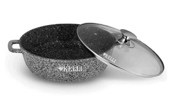 Доп. опции сковород/кастрюль Антипригарное мраморное покрытие; Силиконовые накладки ручка; Жаропрочная стеклянная крышка с паровыпуском