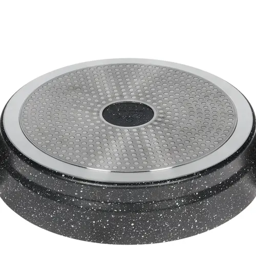 Дно сотейника усилено вставками из магнитного сплава, что позволяет использовать его на индукционных плитах.