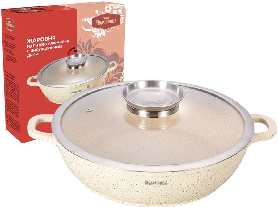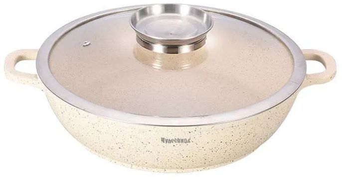 Жаровня с крышкой. Литой алюминий, стеклянная крышка с системой Aroma-фильтр, объем 5,5л, толщина 5мм, размер 32х7,5см, 3-х слойное антипригарное мраморное покрытие, 5-ти слойное теплоаккумулирующее дно, подходит для всех плит, можно мыть в посудомоечной машине, литые ручки с силиконовыми накладками