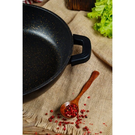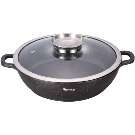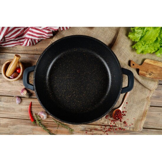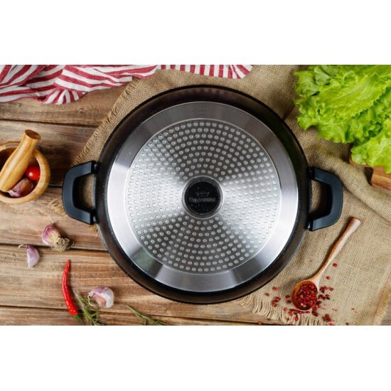 Жаровня с крышкой. Литой алюминий, стеклянная крышка с системой Aroma-фильтр, объем 5,5л, толщина 5мм, размер 32х7,5см, 3-х слойное антипригарное мраморное покрытие, 5-ти слойное теплоаккумулирующее дно, подходит для всех плит, можно мыть в посудомоечной машине, литые ручки с силиконовыми накладками