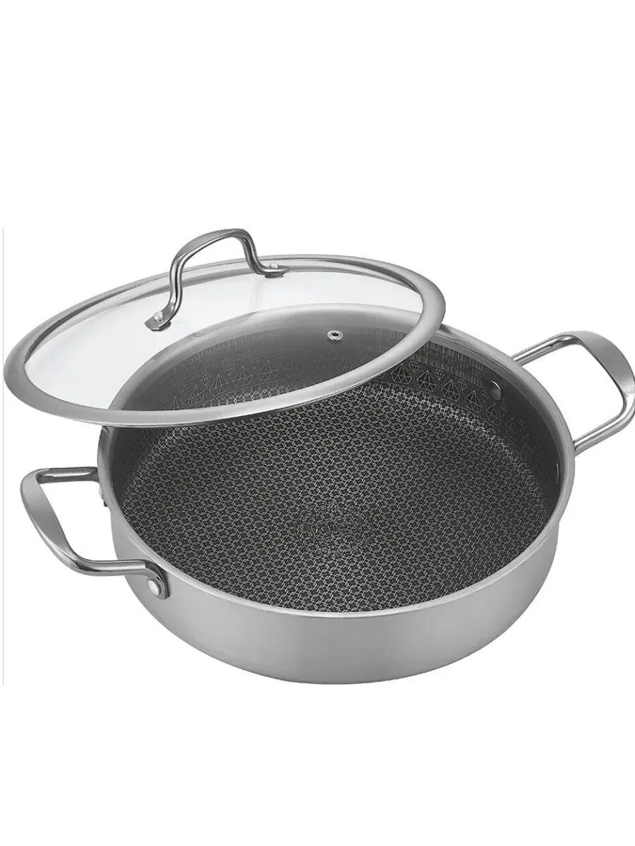 антипригарное покрытие, подходит для всех видов кухонных плит, в том числе индукционных, трёхслойный корпус