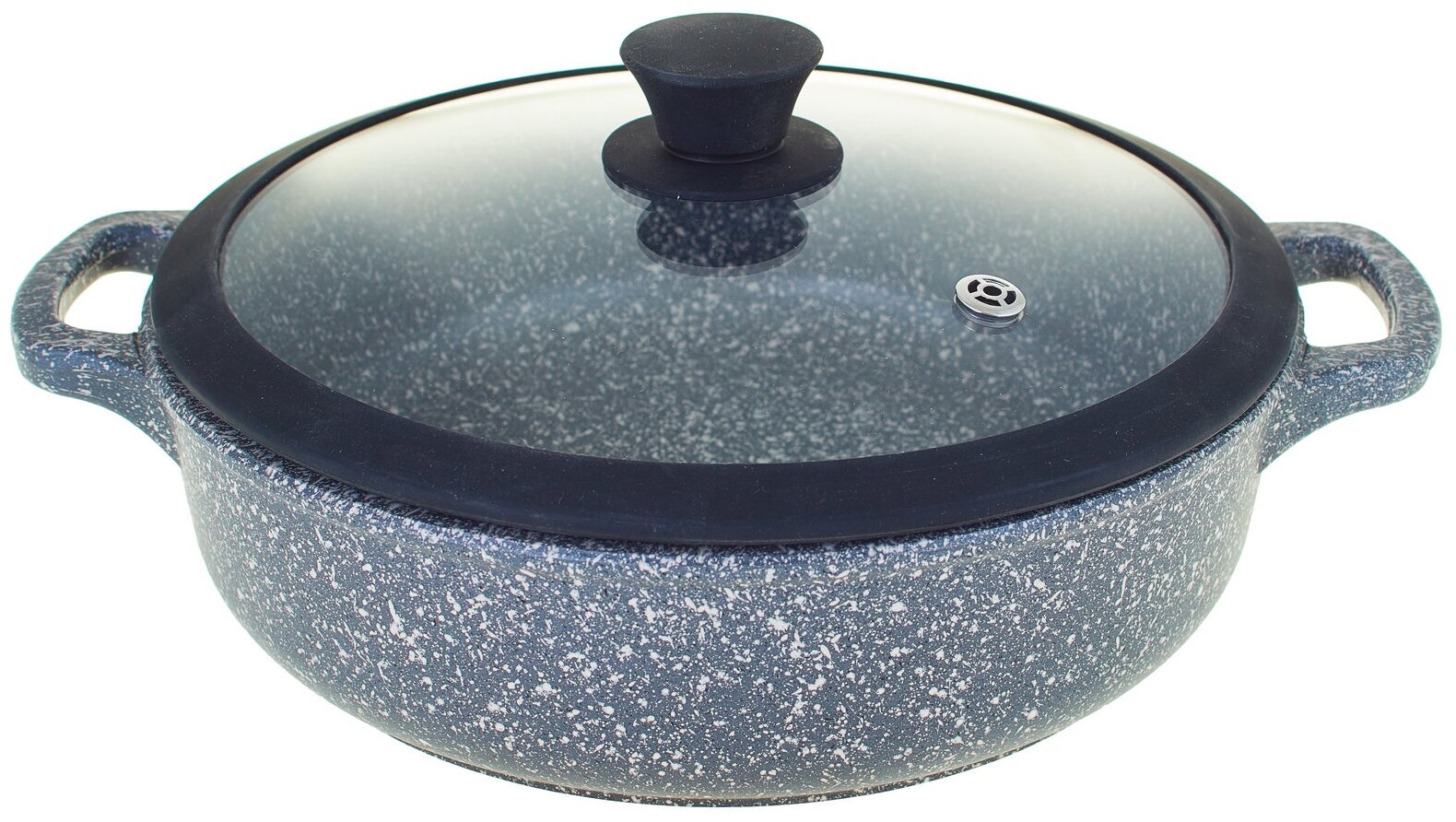 Литая посуда с антипригарным покрытием ТМ традиция Мрамор отлично подойдет для жарки мяса или рыбы, тушения овощей, пассировки, приготовления жаркого и других блюд.