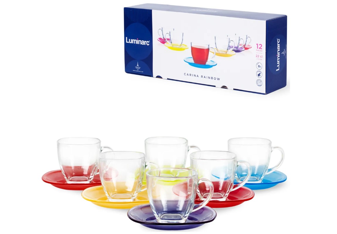 Чайный сервиз состоит из шести чашек и шести блюдец. Предметы набора изготовлены из прочного натрий-кальций-силикатного стекла. Изящный чайный набор великолепно украсит стол к чаепитию и порадует вас и ваших гостей ярким дизайном и качеством исполнения.