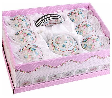 Чайный набор LORAINE на 6 персон выполнен из фарфора высокого качества и оформлен красивым цветочным рисунком. Изящный дизайн придется по вкусу и ценителям классики, и тем, кто предпочитает утонченность и изысканность. Набор упакован в стильную подарочную коробку, оформленную изнутри белой атласной тканью. Каждый предмет надежно зафиксирован внутри коробки благодаря специальным выемкам. Чайный набор - идеальный и необходимый подарок для Вашего дома и для Ваших друзей в праздники, юбилеи и торжества! Также он станет отличным корпоративным подарком и украшением любой кухни. Подходит для мытья в посудомоечной машине. В наборе: 6 чашек, 6 блюдец и заварочный чайник.