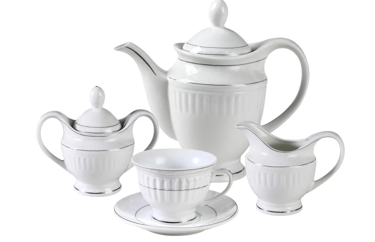 В сервиз входят: Чашка – 6 шт. (160 мл); Блюдце – 6 шт. (Ø 14,0 см); Чайник заварочный с крышкой – 1 шт. (1250 мл); Сахарница с крышкой – 1 шт. (400 мл); Сливочник – 1 шт. (300 мл); Состав: фарфор. Подходит для чистки в посудомоечной машине."