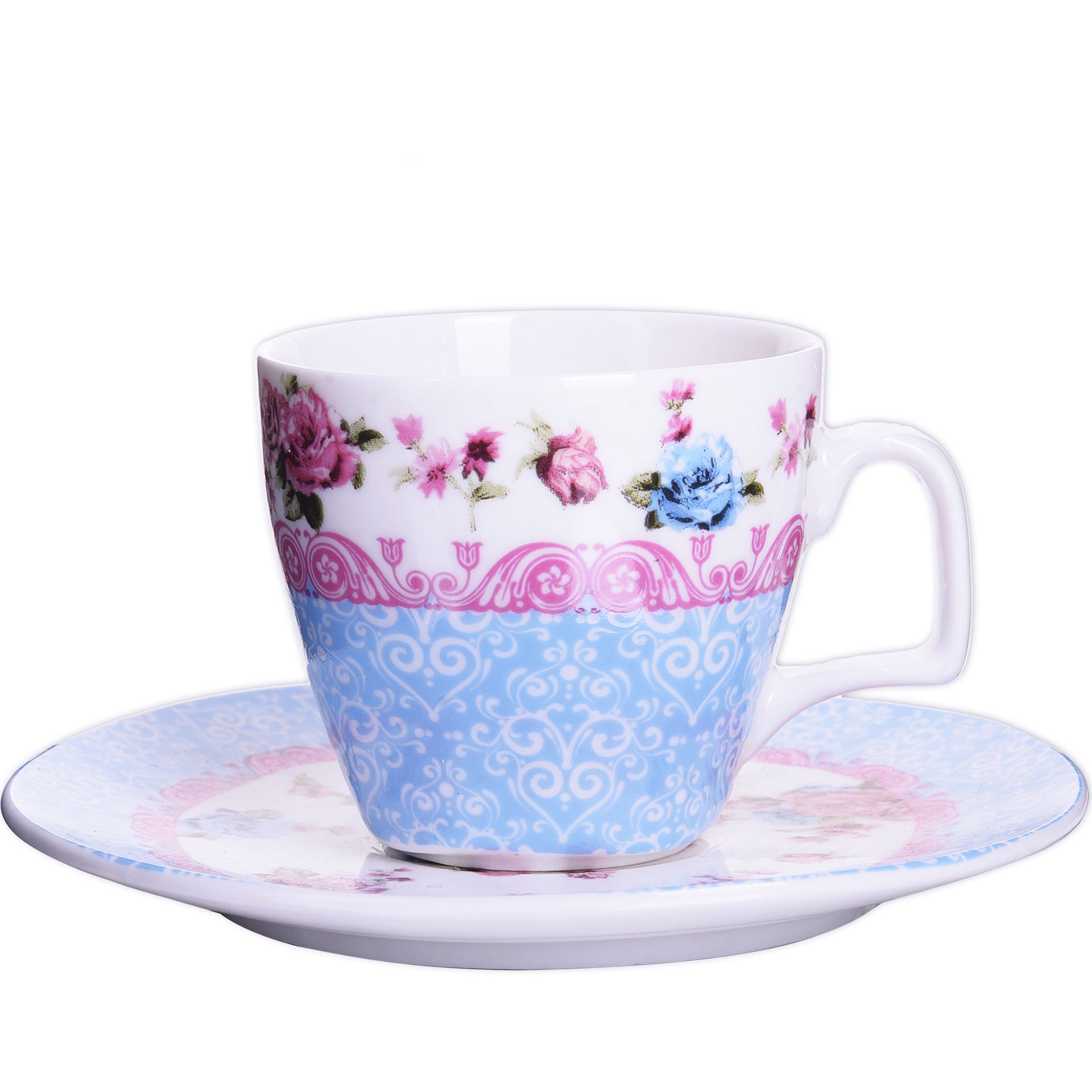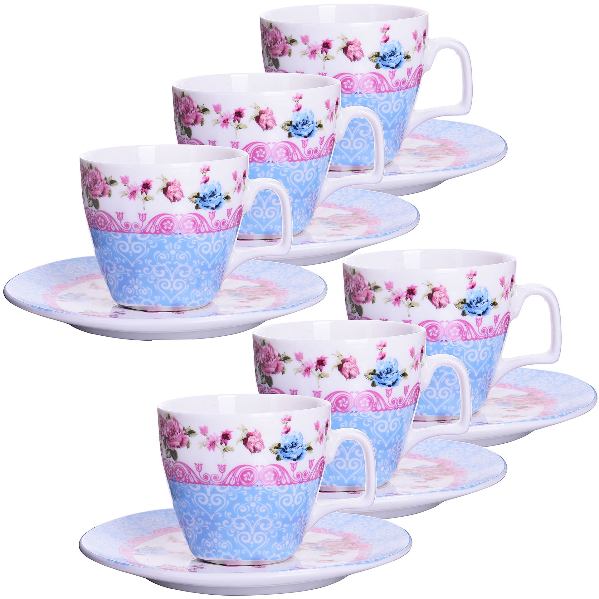 Кофейный набор на 6 персон LORAINE выполнен из качественного фарфора в голубых тонах, с нежным цветочным рисунком. Классический дизайн набора настроит на позитивный лад и подарит хорошее настроение с самого утра. Набор упакован в стильную подарочную коробку. Внутренняя часть коробки задрапирована белой атласной тканью. Каждый предмет надежно зафиксирован внутри коробки благодаря специальным выемкам. Кофейный набор - идеальный и необходимый подарок для вашего дома и для ваших друзей в праздники, юбилеи и торжества! Он также станет отличным корпоративным подарком и украшением любой кухни. Подходит для мытья в посудомоечной машине. В наборе: 6 кофейных чашек, 6 блюдец