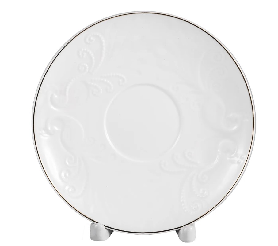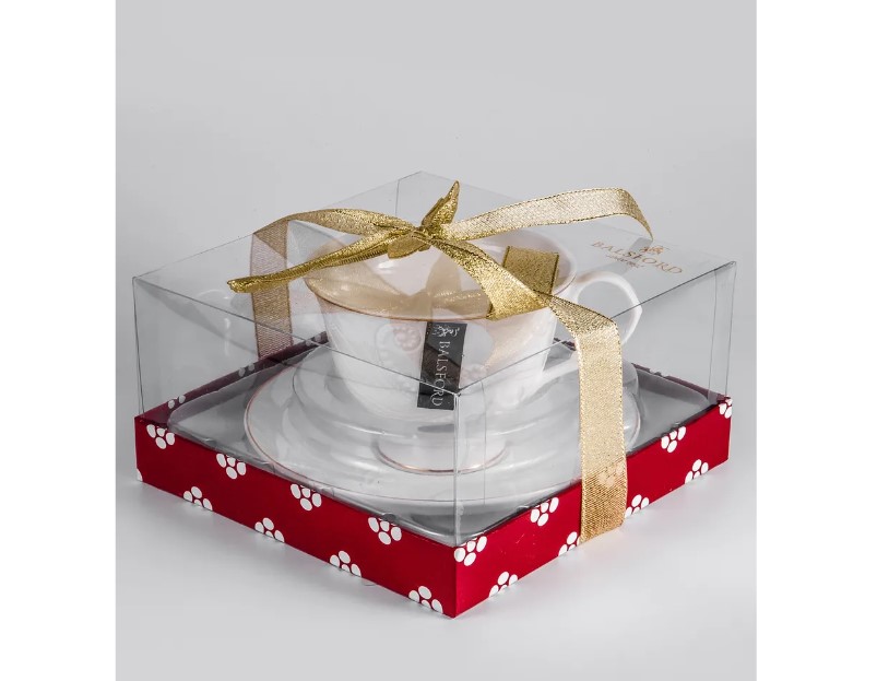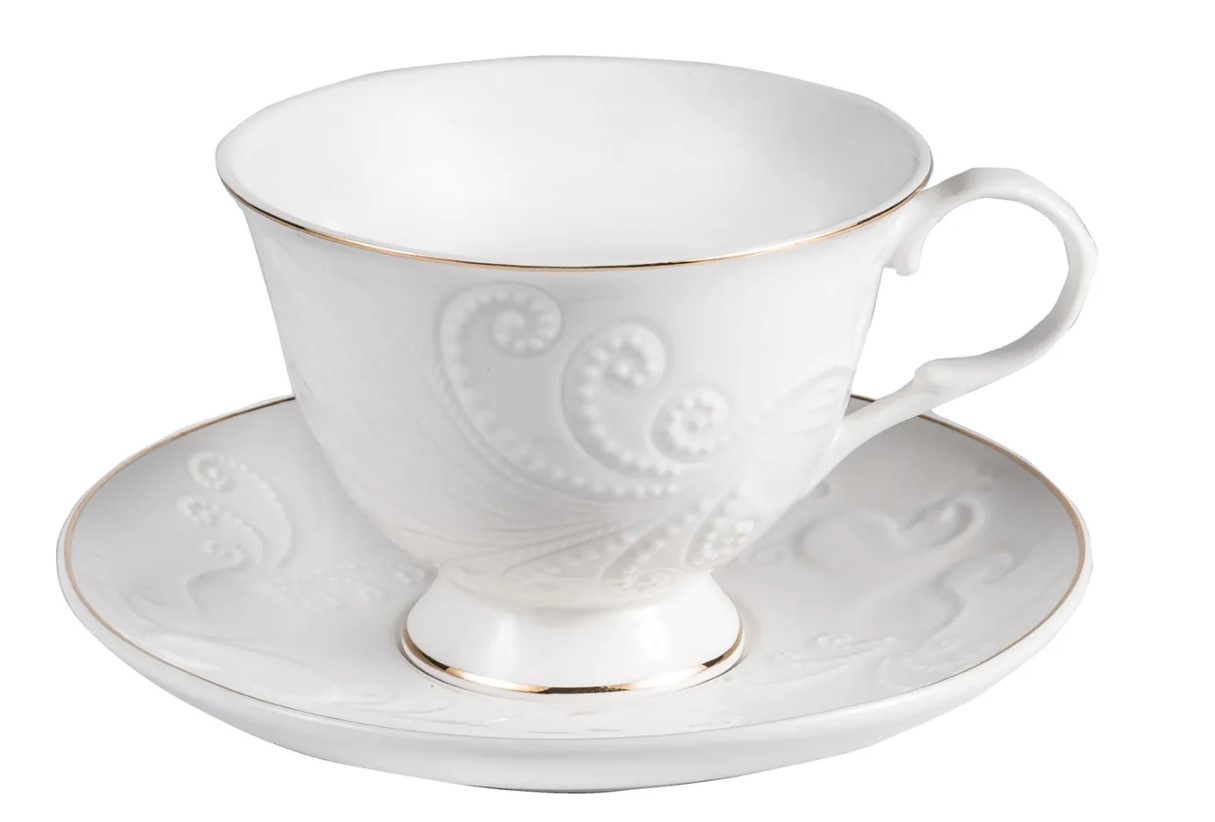 Набор чайный 2 предмета ГРАЦИЯ ЕВНИКА, чашка 220мл и блюдце, изготовлен из фарфора NEW BONE CHINA, белый рельефный рисунок с золотом, подарочная упаковка из прозрачного пластика, с бантом, ТМ Balsford, артикул 101-30024