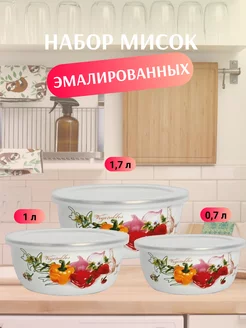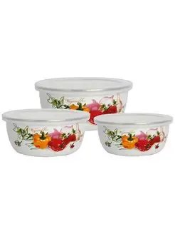 Набор мисок ZEIDAN , 6 предметов, (3 МИСКИ С КРЫШКАМИ: 1) 0,7 л. высота 6 см. диаметр 14 см), 2) 1,0 л. высота 6,5 см. диаметр 16 см), 2) 1,7 л. высота 8 см. диаметр 18 см) с внутренним эмалированным покрытием), эмалированная сталь, внешнее покрытие - эмаль с рисунком. Подарочная упаковка.