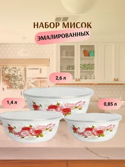 Набор мисок ZEIDAN , 6 предметов, (3 МИСКИ С КРЫШКАМИ 1) 0,85 л. высота 6 см. диаметр 16 см), 2) 1,4 л, высота 7,5 см. диаметр 18 см), 3) 2,6 л. высота 8,5 см. диаметр 20 см) с внутренним эмалированным покрытием), эмалированная сталь, внешнее покрытие - эмаль с рисунком. Подарочная упаковка.