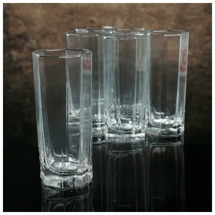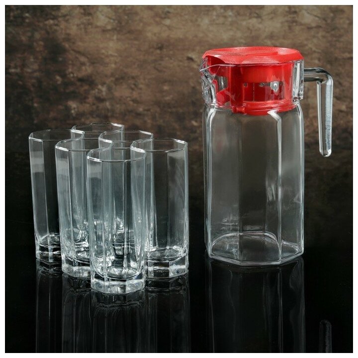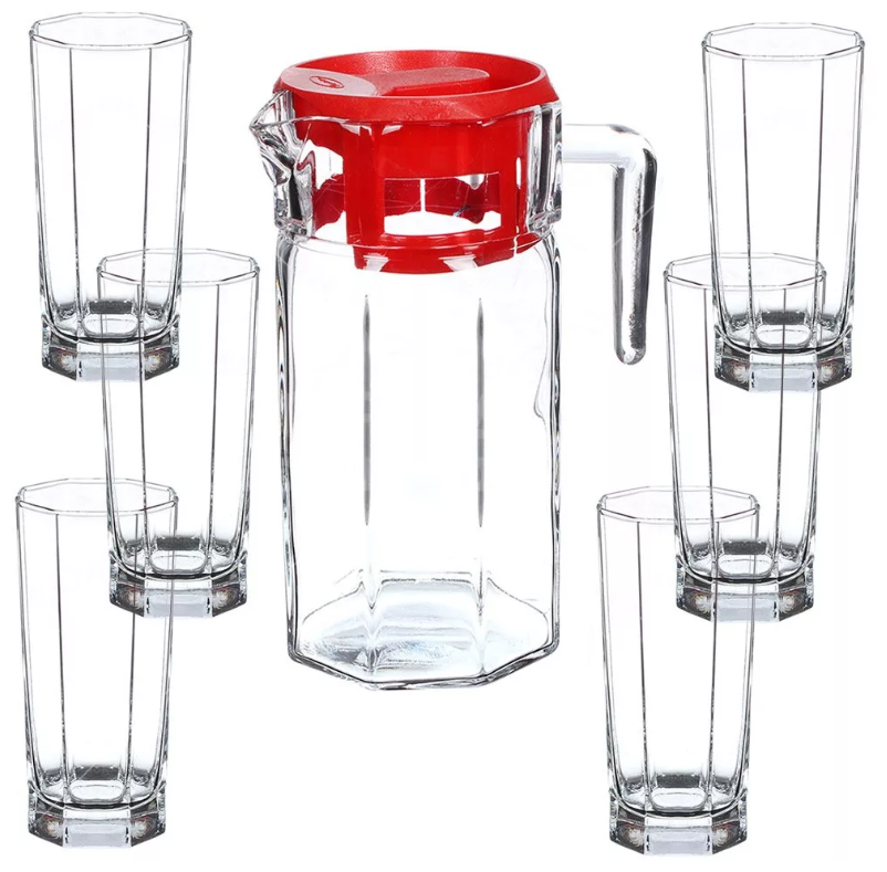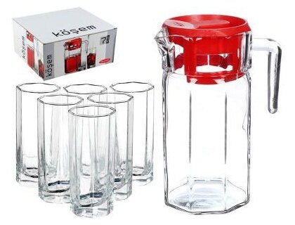 Набор Pasabahce "Kosem" состоит из шести стаканов и графина, выполненных из прочного натрий-кальций-силикатного стекла. Предметы набора, оснащенные рельефной многогранной поверхностью, предназначены для воды, сока и других напитков. Графин снабжен пластиковой, плотно закрывающейся крышкой. Изделия сочетают в себе элегантный дизайн и функциональность. Благодаря такому набору пить напитки будет еще вкуснее. Набор для воды Pasabahce "Kosem" прекрасно оформит праздничный стол и создаст приятную атмосферу.
