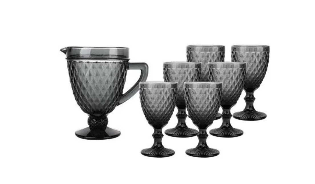 Набор для сока, воды, вина, напитков. Кувшин и шесть бокалов создают элегантную атмосферу. Емкость кувшина 1,3л, бокалов 324мл. Набор представлен в пяти цветовых вариантах лаконичном черном, изысканном голубом, нежном розовым, драгоценном бирюзовом и элегантном зеленом. Набор украсит как повседневный так и праздничный стол. Строгие, лаконичные линии дизайна обращают на себя внимание стилем и оригинальностью исполнения. Набор может послужить хорошим подарком для друзей и знакомых, родных и близких людей.