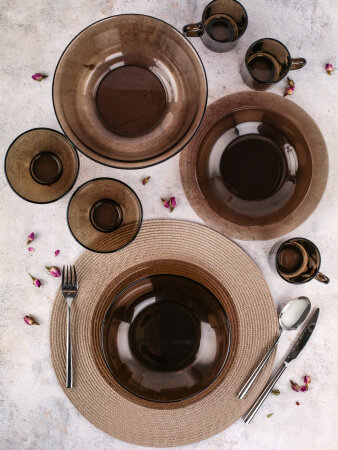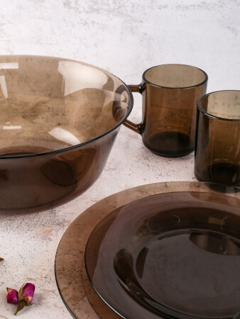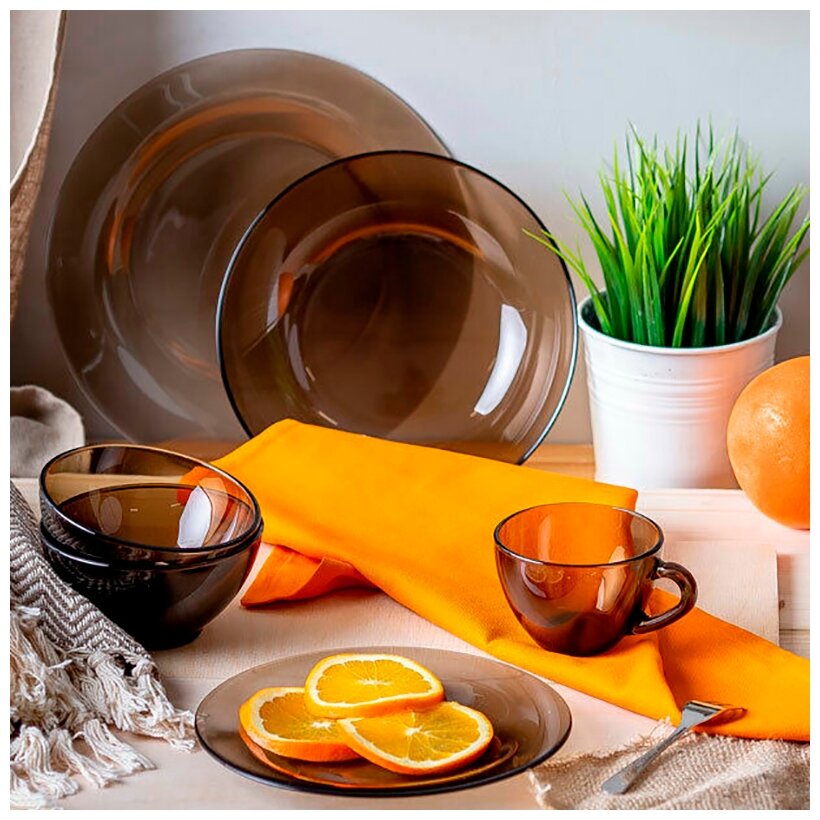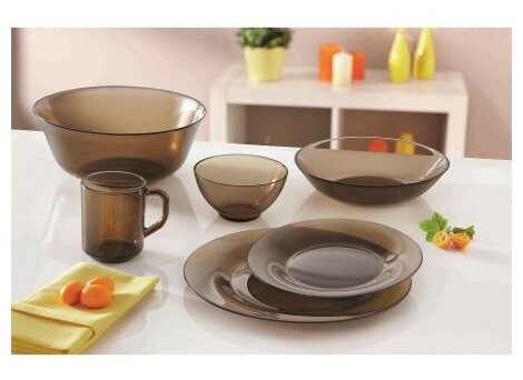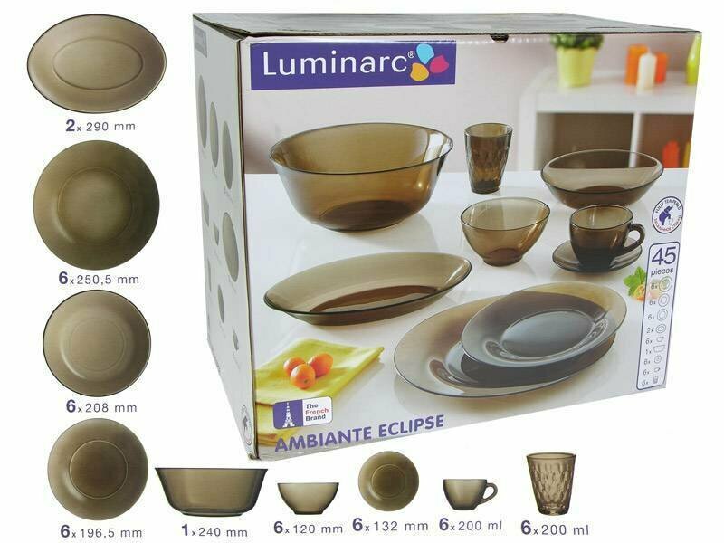 Столовые сервизы бренда Luminarc изготовлены из высококачественного ударопрочного стекла, которое устойчиво к появлению царапин, внешним повреждениям и перепадам температур. Стекло не мутнеет со временем и не выделяет вредных веществ. По сравнению с обычной посудой, оно в 2-3 раза прочнее, и при падении разбивается на крупные неострые куски. В процессе использования стекло не тускнеет и не впитывает запахи Можно мыть в посудомоечной машине и использовать в СВЧ-печи.