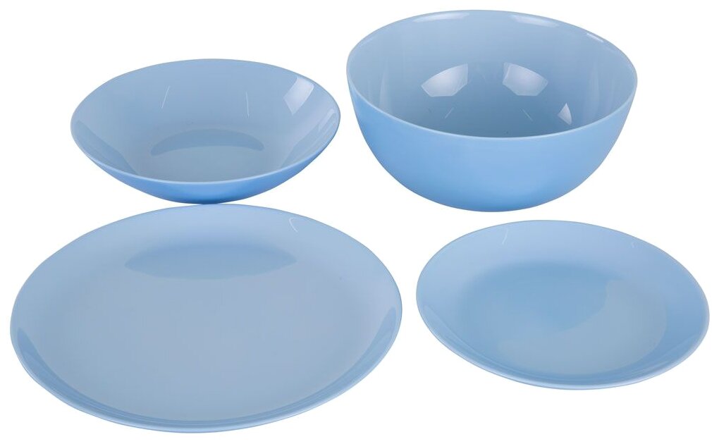 Стеклянный сервиз с большим глубоким салатником нежного голубого цвета - сочетание невысокой цены и модных тенденций в сервировке. Если хотите получить необычное оформление вашего торжества - скомбинируйте с белым или лазурным Diwali Light Turquoise. Закаленное стекло устойчиво к сколам, гигиенично, легко моется.