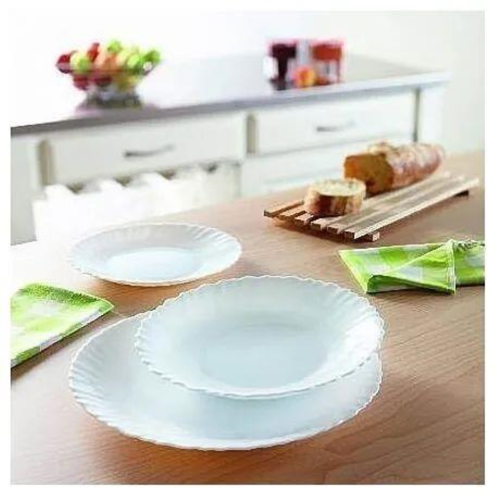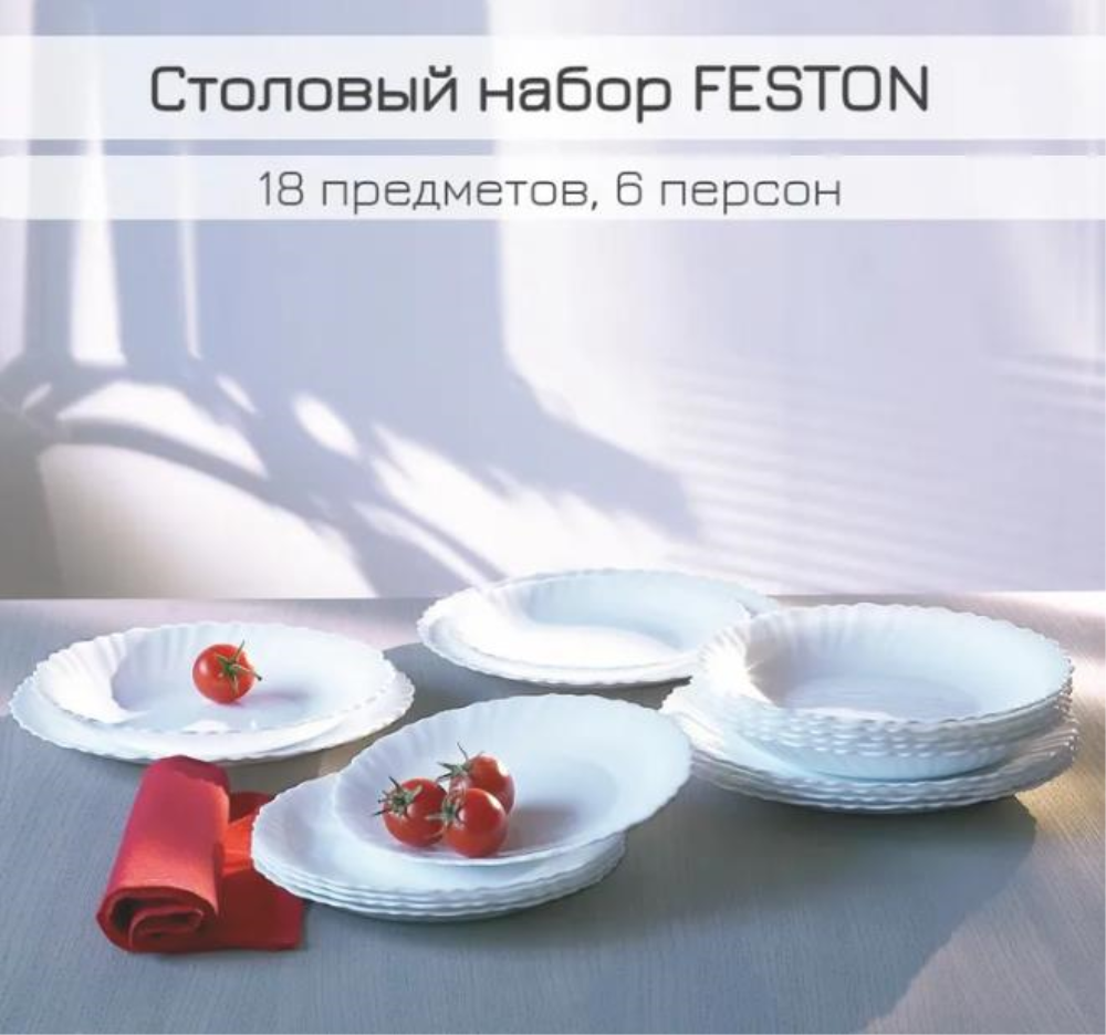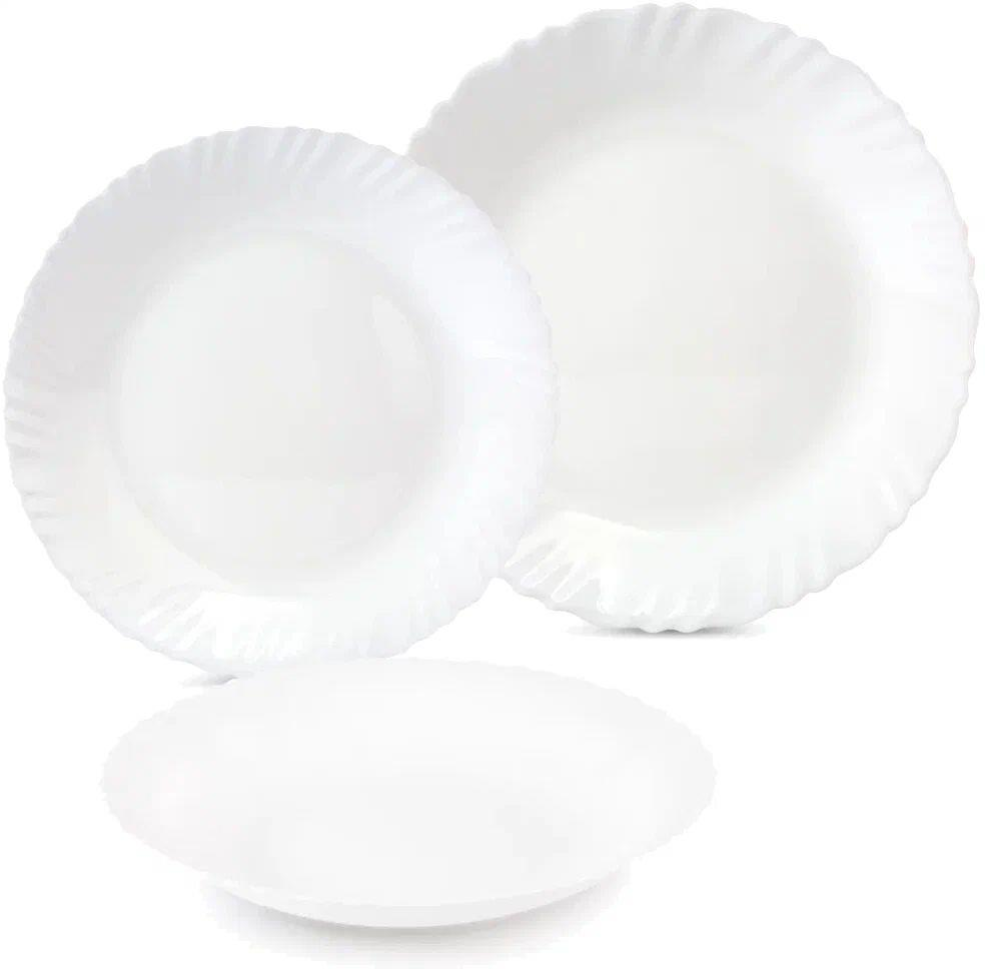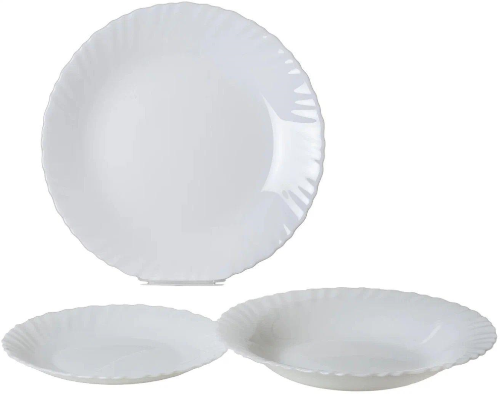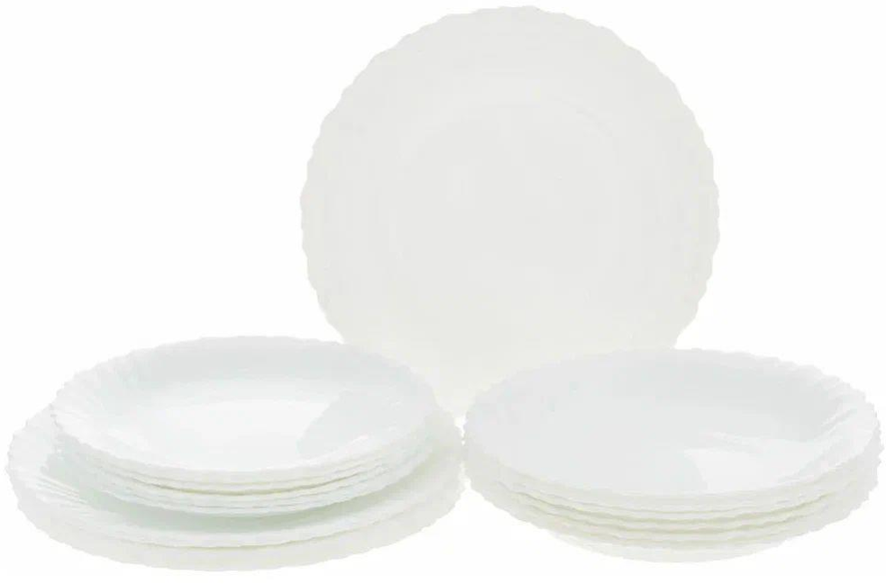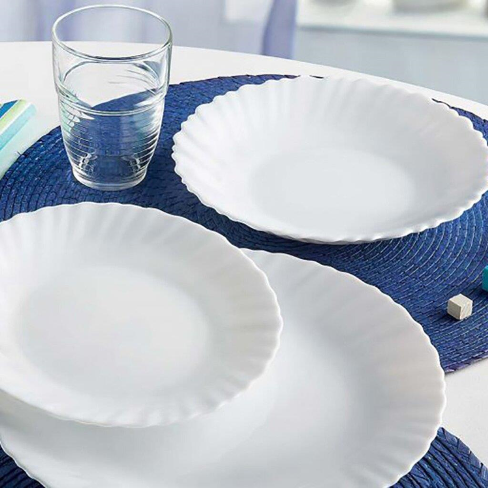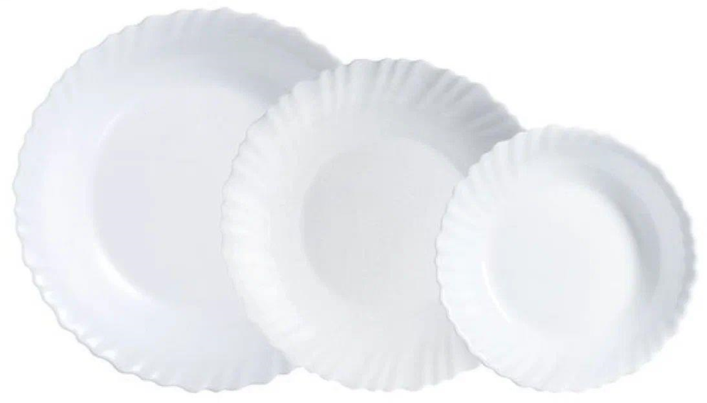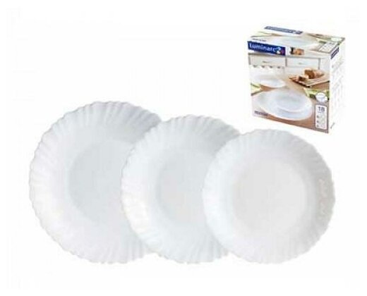 Столовый набор марки Luminarc придется по душе любой хозяйке, ценящей в посуде практичность и надежность. Набор рассчитан на шесть персон и состоит из восемнадцати предметов: суповых, обеденных и десертных тарелок. Белоснежная посуда с изящным рельефным бордюром украсит ежедневный завтрак, обед или ужин и найдет свое место на любой кухне или столовой. Столовый набор, изготовленный из ударопрочного стекла, прослужит долго, сохранив первоначальный внешний вид. Тарелки можно мыть в посудомоечной машине и использовать в СВЧ-печи.