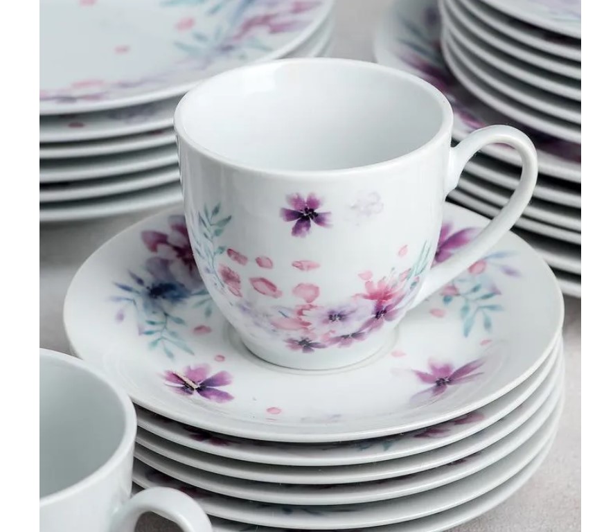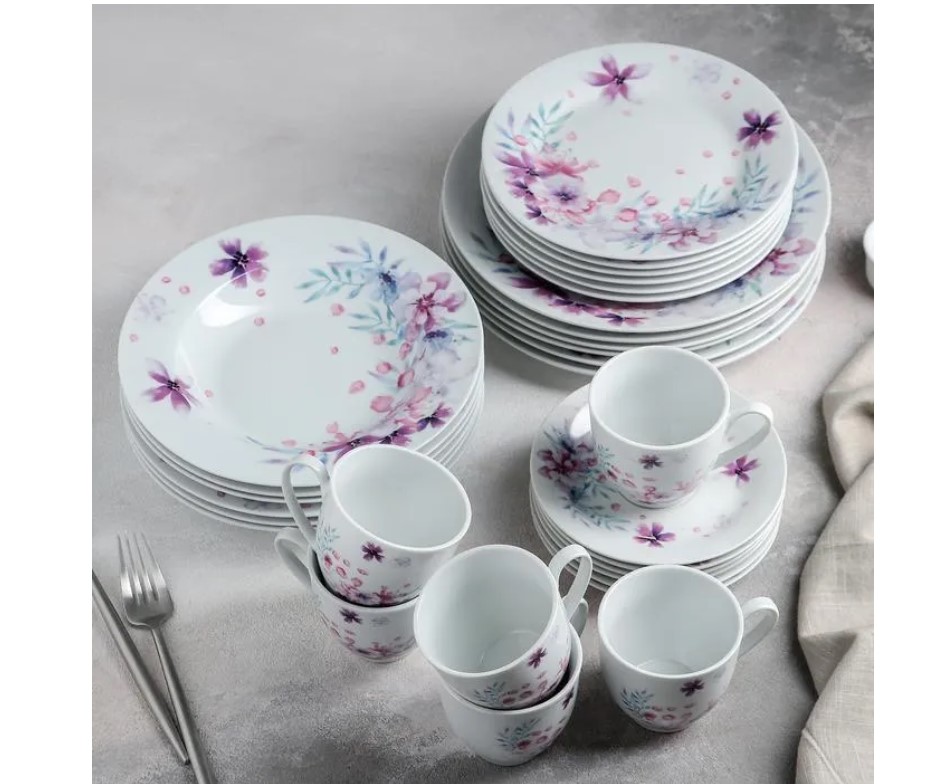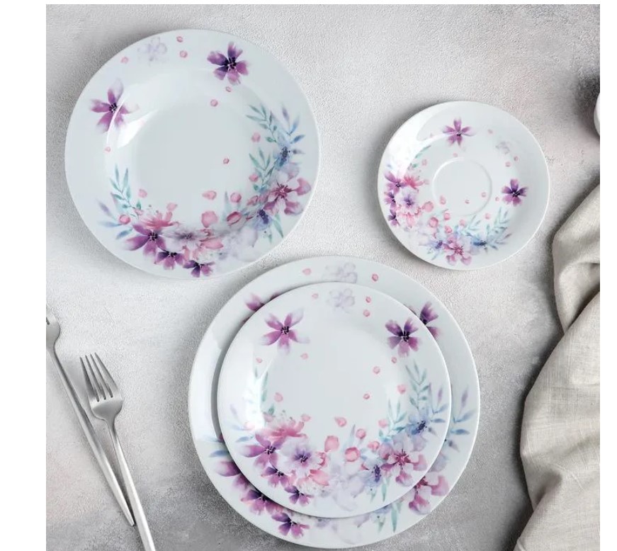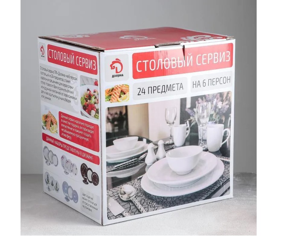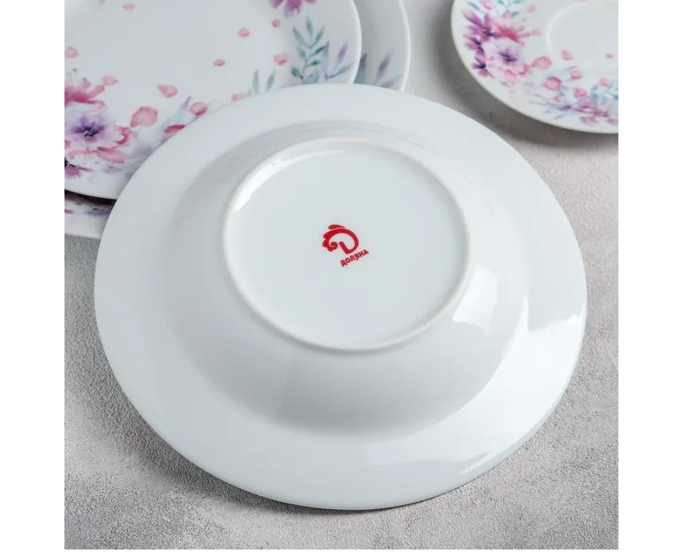 Комплектация В набор входит: тарелка обеденная 24 см - 6 шт.;тарелка суповая 21×3,5 см - 6 шт.;тарелка десертная 19 см - 6 шт.;блюдце 14,5 см - 6 шт.;чашка 200 мл, 10,5×8×7,5 см - 6 шт.