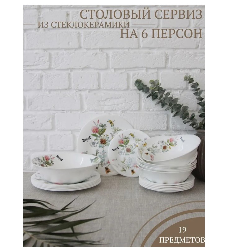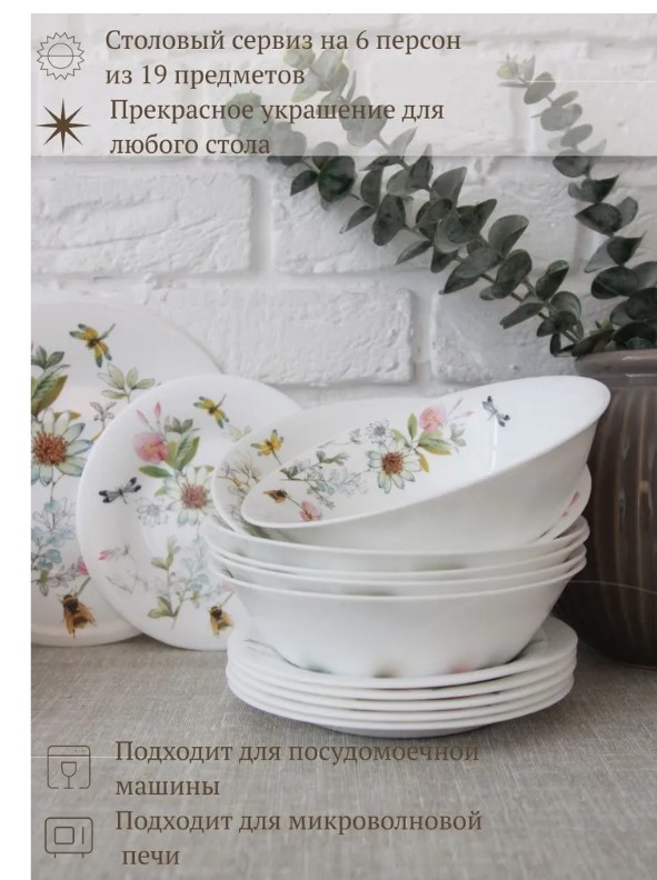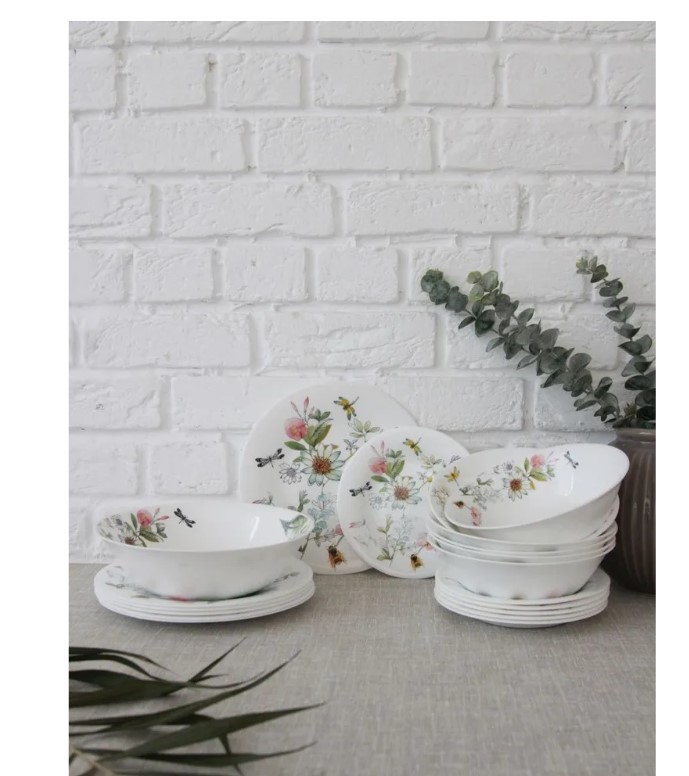Набор посуды столовый выполнен из стеклокерамики. Набор тарелок и салатников отлично подойдет для ежедневного использования или сервировки праздничного стола. Набор посуды поставляется в подарочной упаковке, поэтому вы можете подарить его свои родным и близким на любой праздник. Столовый набор посуды можно использовать в СВЧ и посудомоечной машине. В столовом наборе есть все необходимое - тарелки для вторых блюд, тарелки для десертов. салатники, которые можно использовать как суповые тарелки или тарелки для каши, а также большой салатник, в который можно положить блюдо для всей семьи.
