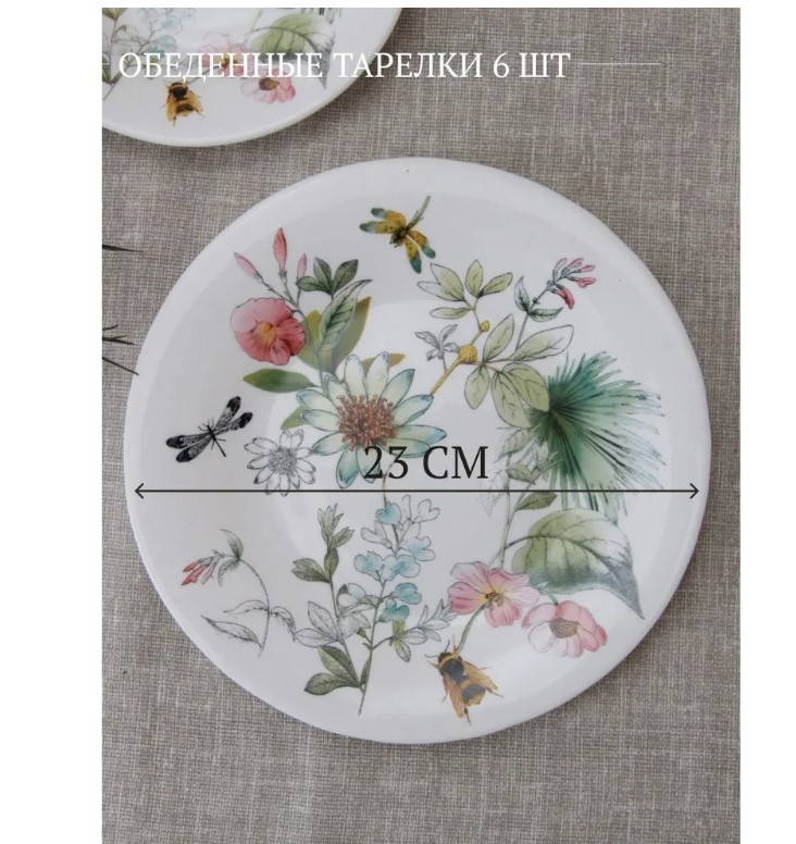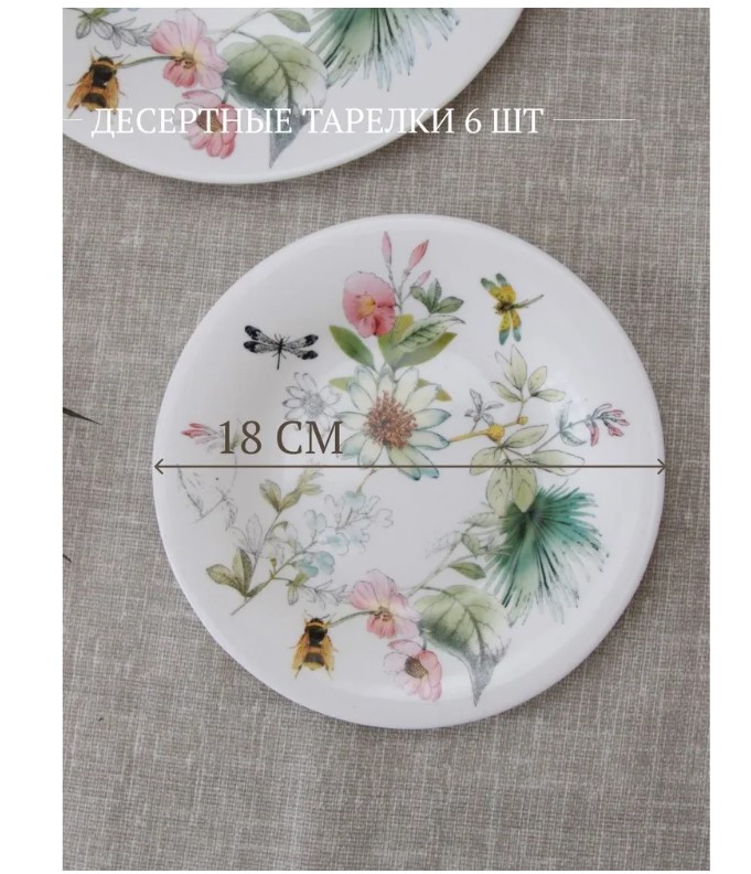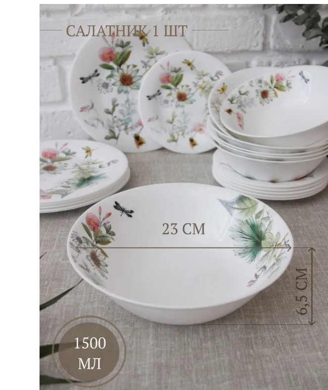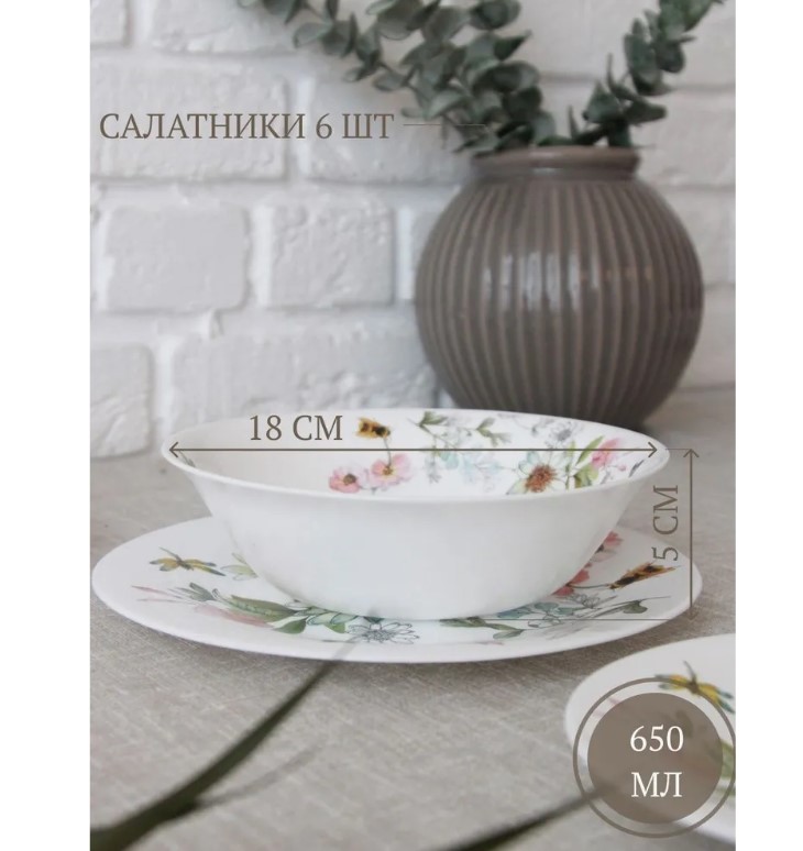 6 десертных тарелок 18 см + 6 обеденных тарелок 23 см + 6 салатников 650 мл 18 см + салатник 1500мл 23 см