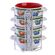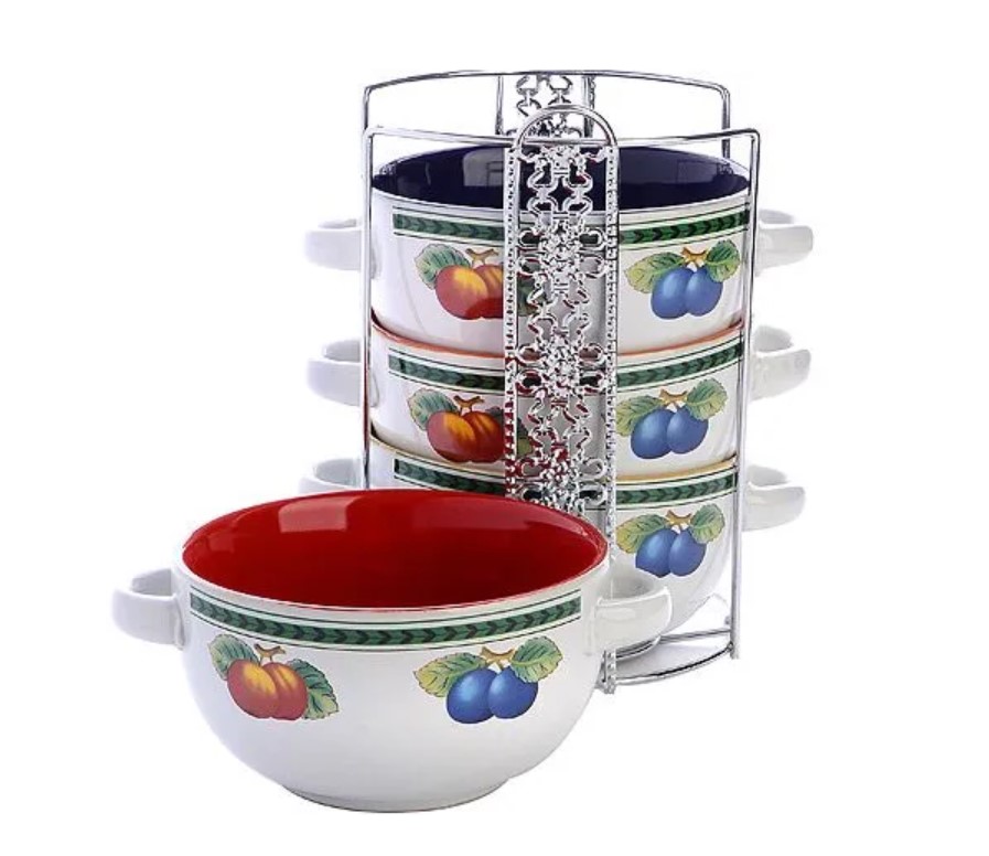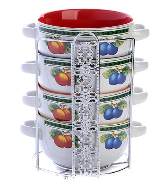 4 супницы, 1 подставка. Подходит для мытья в посудомоечной машине.