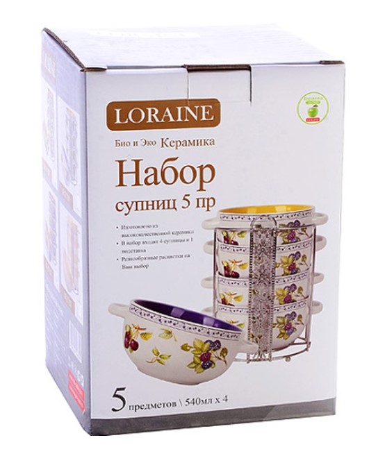 Набор из 4-х супниц LORAINE выполнен из высококачественной керамики и украшен декоративным рисунком. Супницы компактно располагаются на оригинальной подставке из нержавеющей стали и не занимают много места при хранении. В керамической посуде блюда сохраняют свои вкусовые качества, кроме того она обладает термической и химической прочностью. Благодаря оригинальному дизайну, такие супницы отлично подойдут как для ежедневного использования, так и для праздничной сервировки стола. Изделия оснащены двумя удобными ручками.