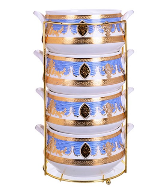 Изделия оснащены двумя удобными ручками. В наборе: 4 супницы, 1 подставка.