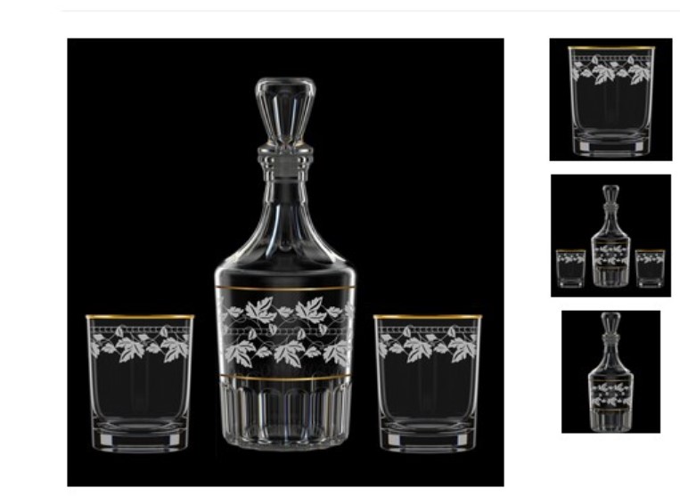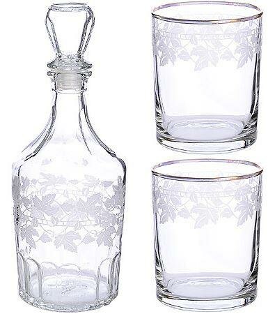 Набор подарочный из 3 предметов в подарочной упаковке - графин 500 мл и 2 стакана 250 мл. Графин и стаканы выполнены из высокопрочного стекла. На изделие нанесена золотая кайма и гравировка с рисунком "Виноградная лоза", что несомненно украшает их и придает благородный вид. Отличный набор для сервировки праздничного стола, напиток в графине будет выглядеть намного эстетичнее, чем в бутылке. Идеальный вариант не только для личного использования, но и в качестве подарка на любой праздник