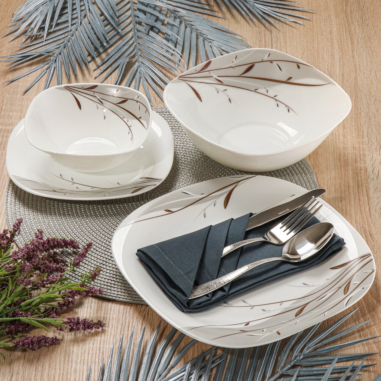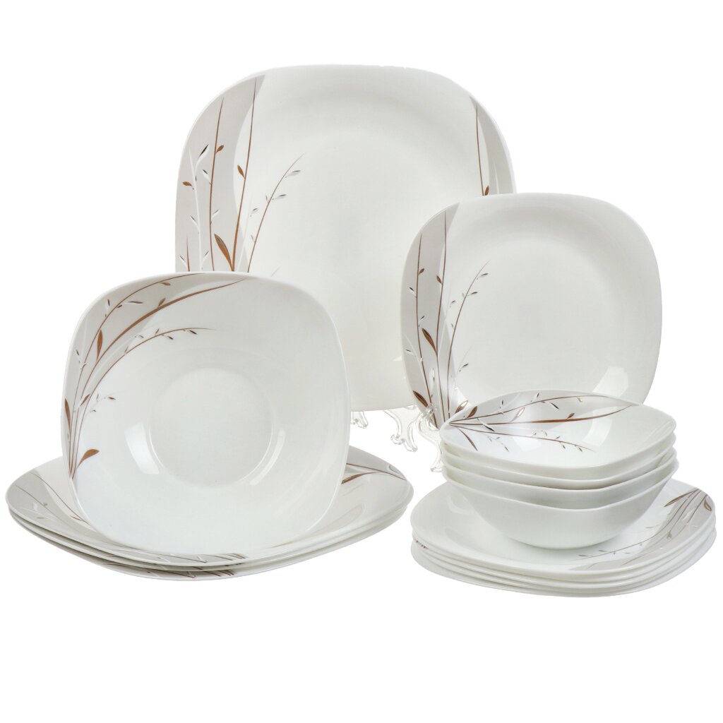 Обеденный сервиз изготовлен из стеклокерамики, имеет стильный дизайн и качественно нанесенный рисунок.