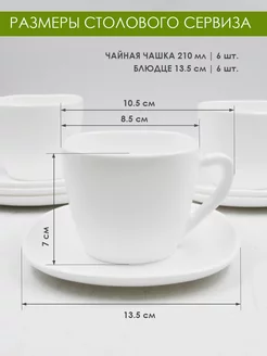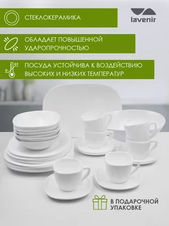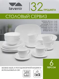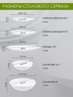 Комплектация Тарелка плоская обеденная 23 см диагональ - 6 шт; Тарелка плоская мелкая десертная 21 см диагональ - 6 шт; Салатник 16 см диагональ - 6 шт; Блюдо для подачи 30 см длина - 1 шт; Кружка для чая - 6 шт; Блюдце под чашку - 6 шт; Салатник 23 см диагональ - 1 шт; Подарочная упаковка - 1 шт