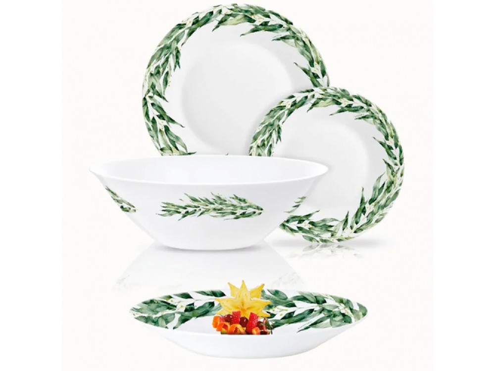 В наборе:салатник, тарелка закусочная (десертная) (6 шт.), тарелка столовая глубокая (6 шт.), тарелка столовая обеденная (6 шт.)