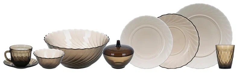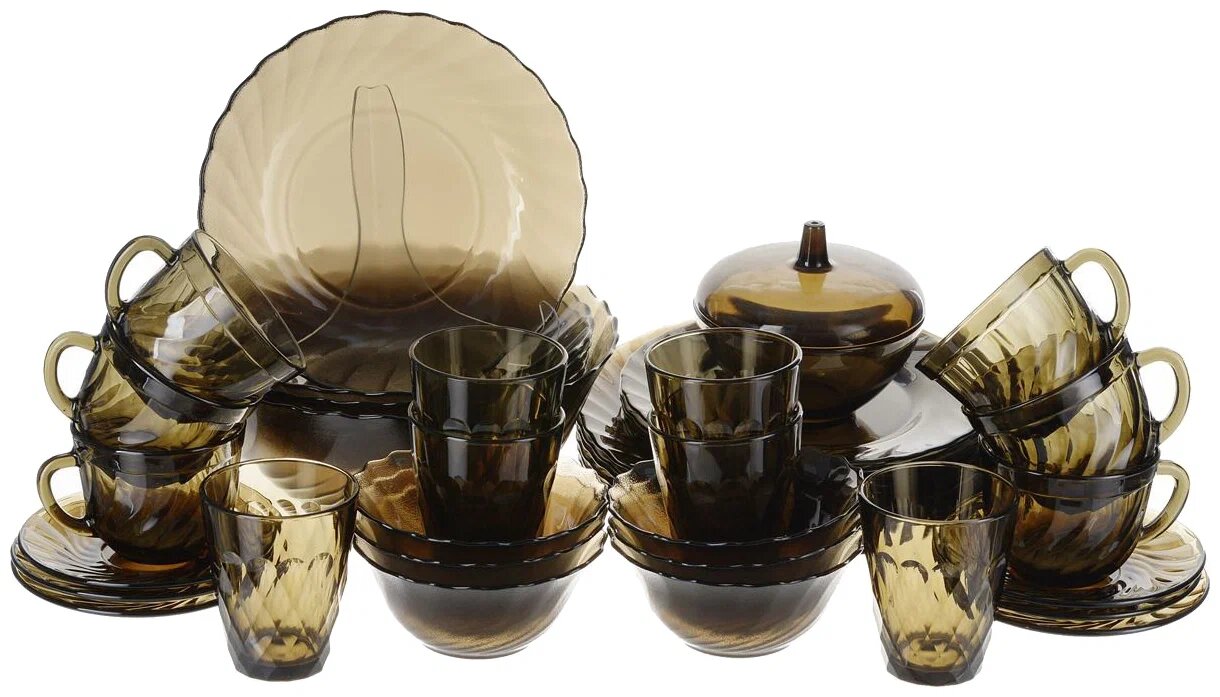 Комплектация:Тарелка десертная 19,5 см х 6. Тарелка обеденная 24,5 см х 1. Тарелка суповая 20,5 см х 6. Салатник малый 12 см 320 мл х 6. Салатник большой 24 см 2300 мл х 6. Стакан 160 мл х 6. Блюдце х 6. Чашка 220 мл х 6. Сахарница 11 см х 1. Крышка сахарницы х 1