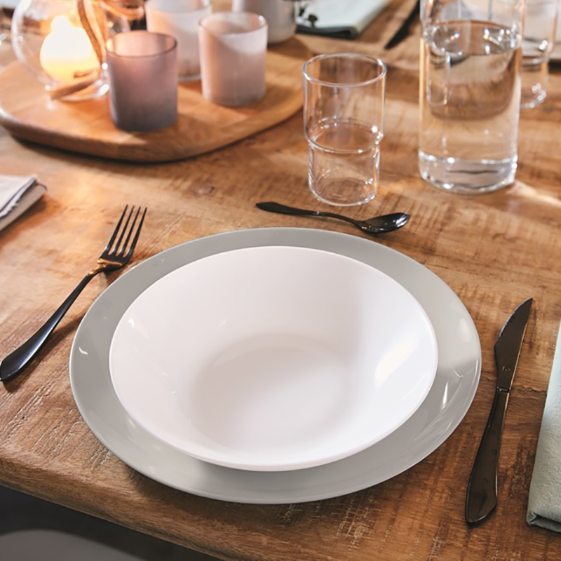 Обеденная стеклянная тарелка Luminarc из коллекции Diwali Granit (Дивали Гранит). Тарелка жемчужно-серого цвета для подачи вторых блюд. Можно использовать, как подстановочную и как маленькое блюдо для подачи нарезки.