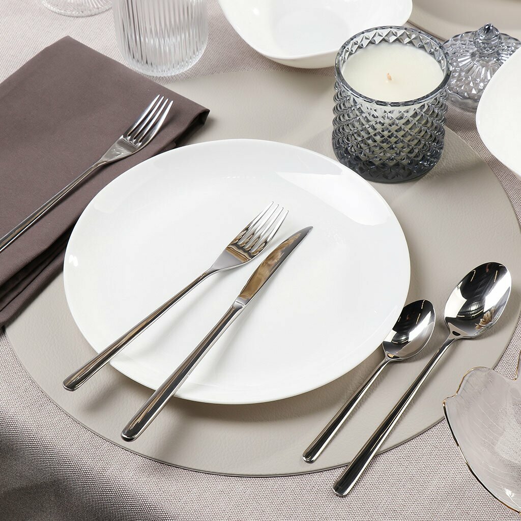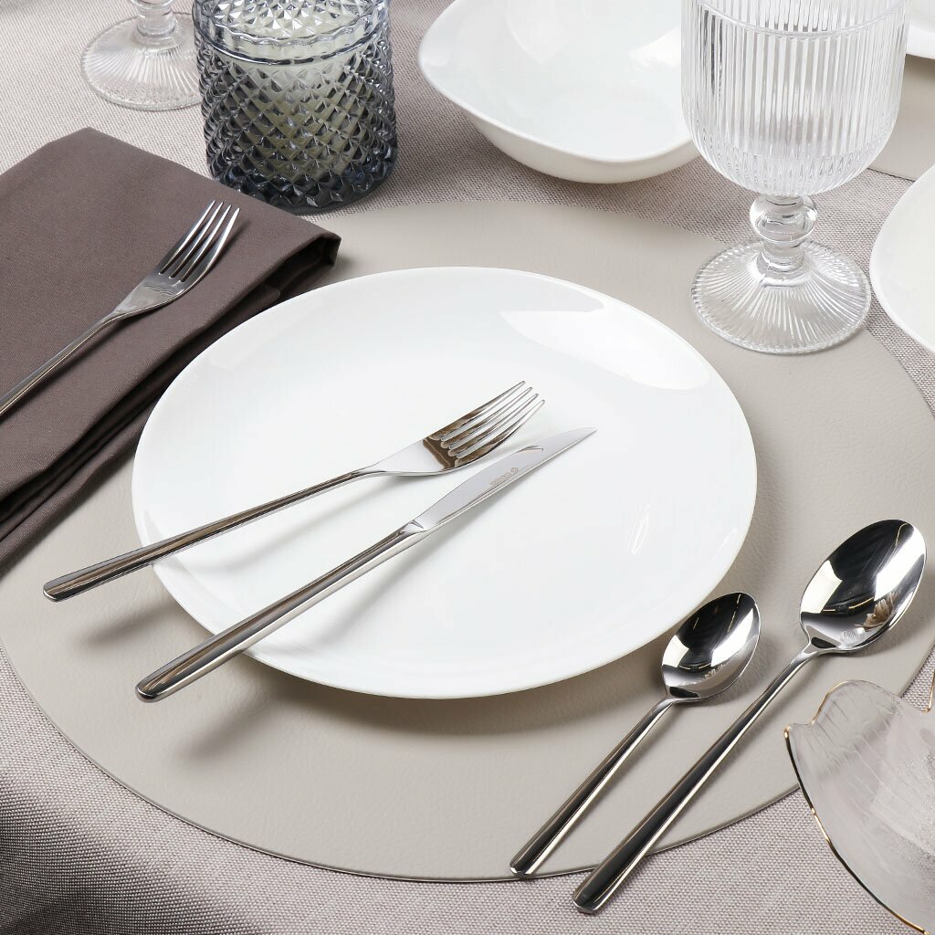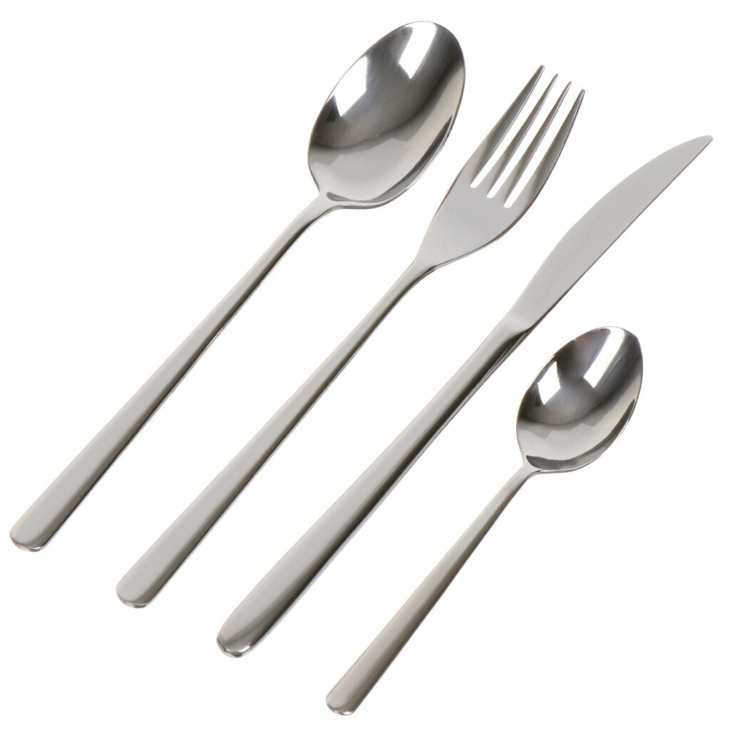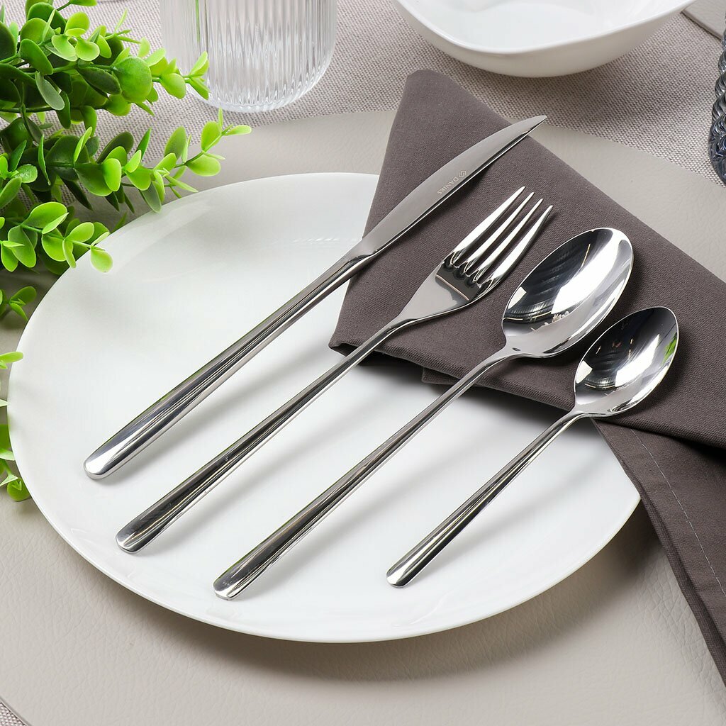 Набор столовых приборов выполнен из нержавеющей стали высочайшего качества и отличаются особой прочностью и долговечностью в использовании. Приборы рассчитаны на шесть персон. Столовые приборы выполнены в минималистическом дизайне, ручки приборов декорированы рельефным узором. Стильный, классический дизайн и отличное качество столовых приборов делают набор желанной покупкой.