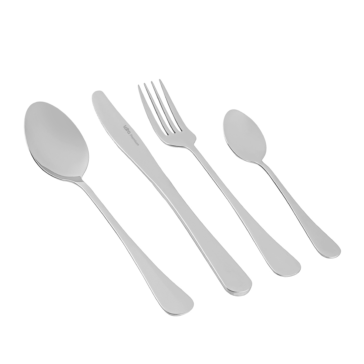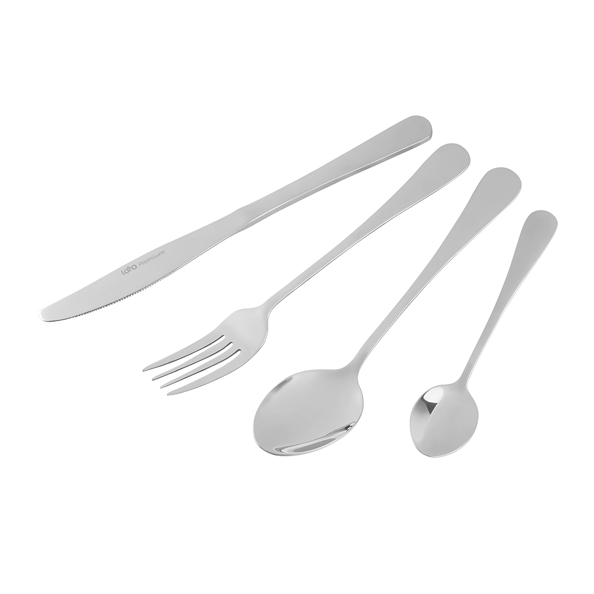 Столовые приборы LARA LR10-24/24 Майя – это сочетание лаконичного дизайна и превосходного качества. В наборе 24 предмета на 6 персон. Каждый предмет идеально сбалансирован, ручки имеют специальную форму и отлично лежат в руке. Комплект изготовлен из пищевой нержавеющей стали, не имеет запаха и сохраняет вкус и аромат продуктов. Все изделия высокого качества и очень прочные, не гнутся, имеют длительный срок службы, отлично сохраняют эксплуатационные свойства. Столовые приборы Lara подходят как для ежедневного использования, так и для сервировки праздничного стола. Можно мыть в посудомоечной машине.