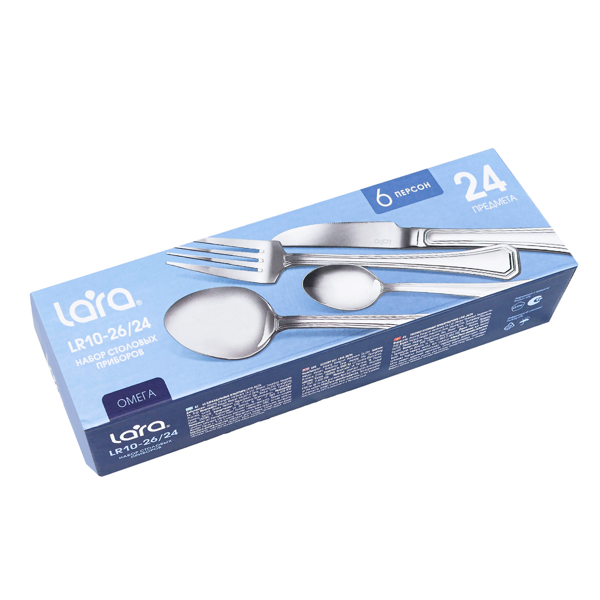 Столовые приборы LARA LR10-26/24 Омега – это превосходный набор высокого качества, включающий 24 предмета на 6 персон. Лаконичный дизайн изделий дополняют акцентные линии на ручках. Каждый предмет идеально сбалансирован, ручки имеют специальную форму и отлично лежат в руке. Комплект изготовлен из пищевой нержавеющей стали, не имеет запаха и сохраняет вкус и аромат продуктов. Все изделия высокого качества и очень прочные, не гнутся, имеют длительный срок службы, отлично сохраняют эксплуатационные свойства. Столовые приборы Lara подходят как для ежедневного использования, так и для сервировки праздничного стола. Можно мыть в посудомоечной машине.