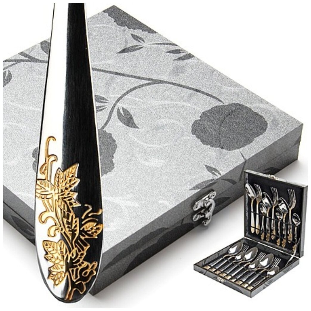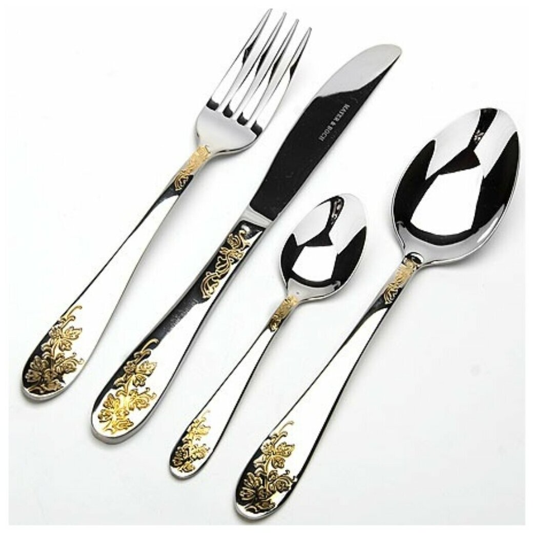 Набор столовых приборов MAYER&BOCH на 6 персон включает в себя 18 предметов: 6 столовых ложек, 6 столовых вилок, 6 чайных ложек. Столовые приборы изготавливаются из высококачественной нержавеющей стали, все изделия проходят тщательный технологический контроль. Приборы из нержавеющей стали такого состава отличаются высокими антикоррозионными свойствами, значительной устойчивостью к воздействию кислот и щелочей. Такая сталь не изменяет вкус и цвет пищи, не выделяет вредных веществ. Элегантные золотые узоры на столовых приборах выполнены по технологии плазменного напыления, обеспечивающего высокую износостойкость покрытия. Стильный, классический дизайн и отличное качество столовых приборов MAYER&BOCH делают набор желанной покупкой для любого, даже самого пристрастного, клиента. Набор столовых приборов MAYER&BOCH, безусловно, займет достойное место на любой кухне. Набор подходит как для ежедневного использования, так и для торжественных случаев. Набор упакован в красивый подарочный деревянный кейс. Подходит для мытья в посудомоечной машине.