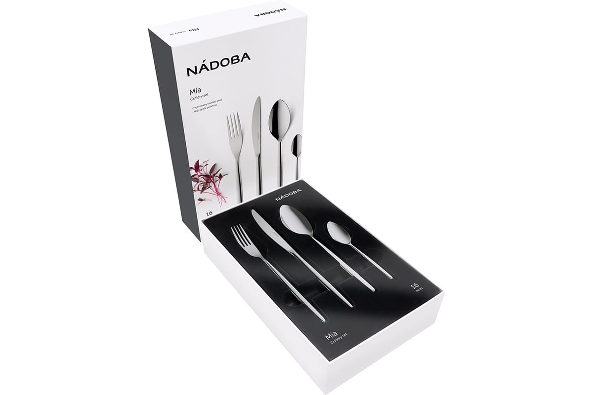 Набор столовых предметов NADOBA серии Mía состоит из: столовая ложка 4 шт., столовая вилка 4 шт., столовый нож 4 шт., чайная ложка 4 шт. Изделия выполнены из высококачественной нержавеющей стали. Благодаря прочному материалу столовые приборы не подвержены деформации и сохраняют первоначальный вид даже при ежедневном использовании. Столовые приборы NADOBA серии Mía изготовлены методом ковки, поэтому более массивны и отличаются объемными формами. За счет устойчивости к воздействию любых сред изделия не меняют вкус еды. Зеркальная полировка добавляет посуде блеска и красоты. Элегантный стиль упаковки делает набор прекрасным и функциональным подарком. Столовые приборы допускается мыть в посудомоечной машине.