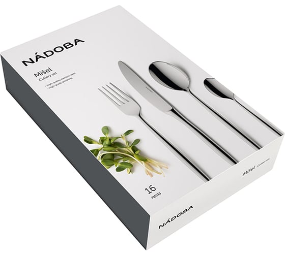 Набор столовых предметов NADOBA серии Misel состоит из: столовая ложка 4 шт., столовая вилка 4 шт., столовый нож 4 шт., чайная ложка 4 шт. Изделия выполнены из высококачественной нержавеющей стали. Благодаря прочному материалу столовые приборы не подвержены деформации и сохраняют первоначальный вид даже при ежедневном использовании. Утонченные приборы NADOBA серии Misel изготовлены методом ковки, поэтому более массивны и приятно ощутимы в руке. За счет устойчивости к воздействию любых сред изделия не меняют вкус еды. Зеркальная полировка добавляет посуде блеска и красоты. Элегантный стиль упаковки делает набор прекрасным и функциональным подарком. Столовые приборы допускается мыть в посудомоечной машине.