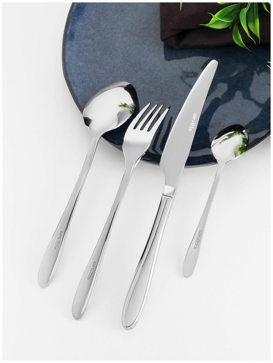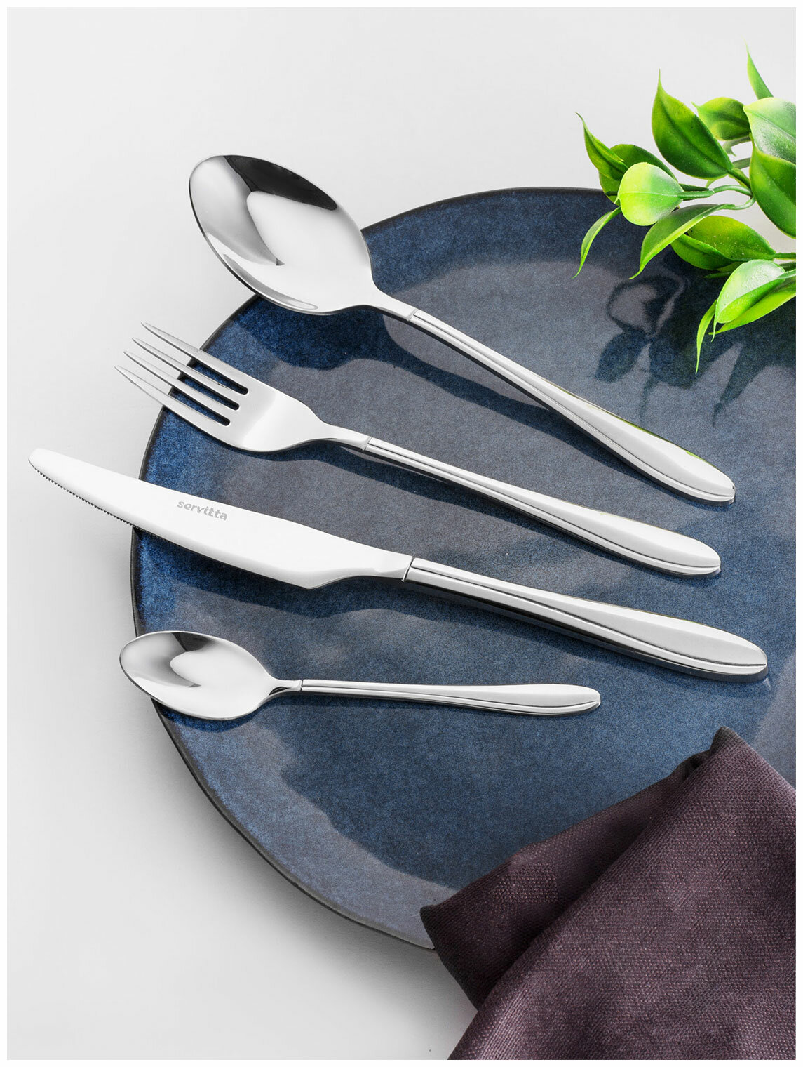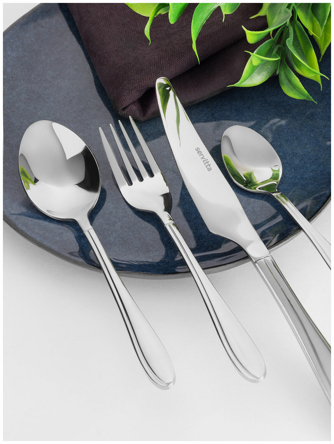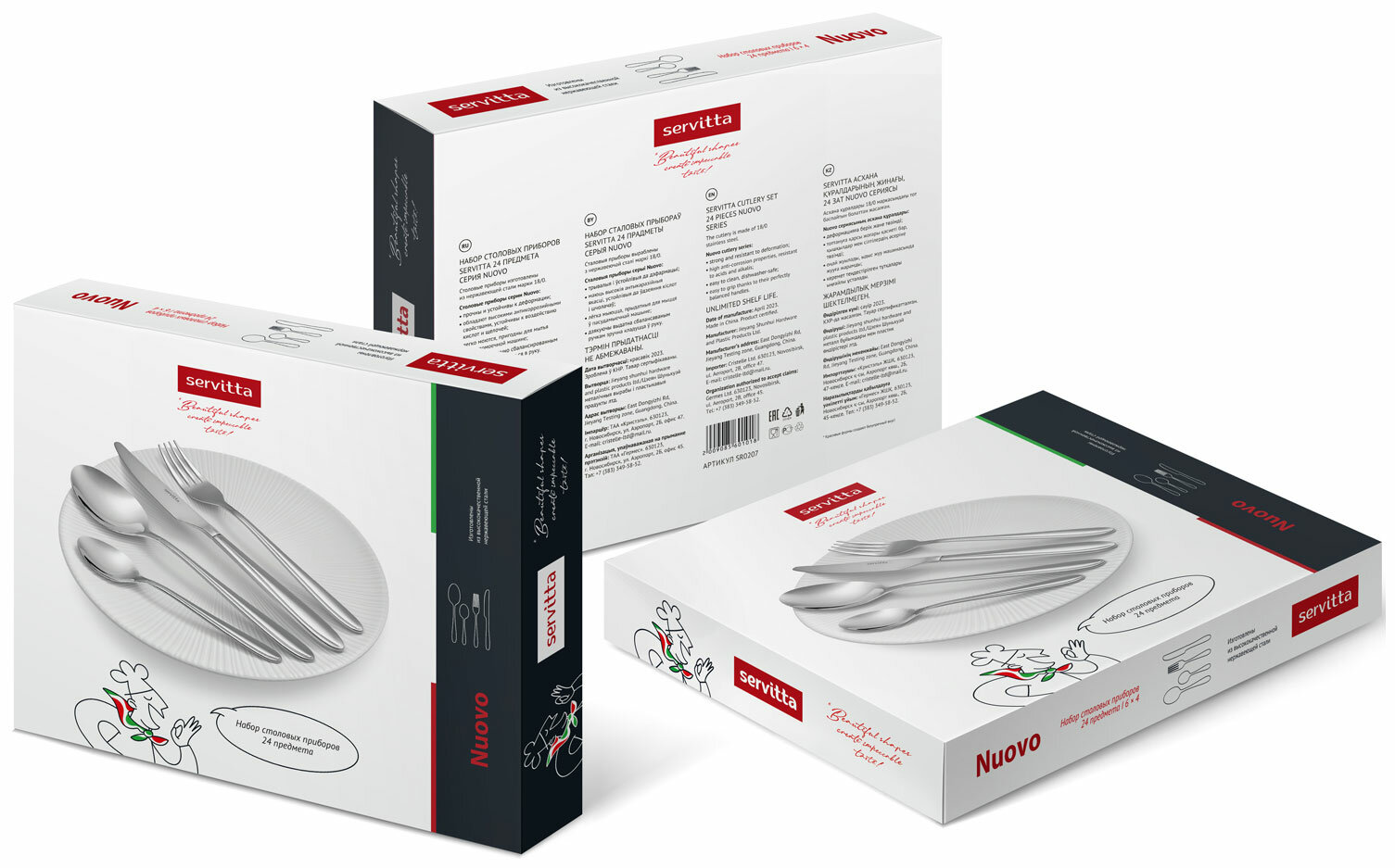 Набор столовых приборов 24 предмета Nuovo. Изготовлен из высококачественной нержавеющей стали. Зеркальная полировка сохранит блеск на долгое время, а универсальный дизайн подойдёт для любой кухни. Можно мыть в посудомоечной машине.