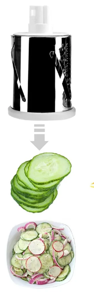 Овощерезка легко собирается и разбирается, что упрощает ее мойку и хранение. Не скользит по столу за счет удобной присоски.
