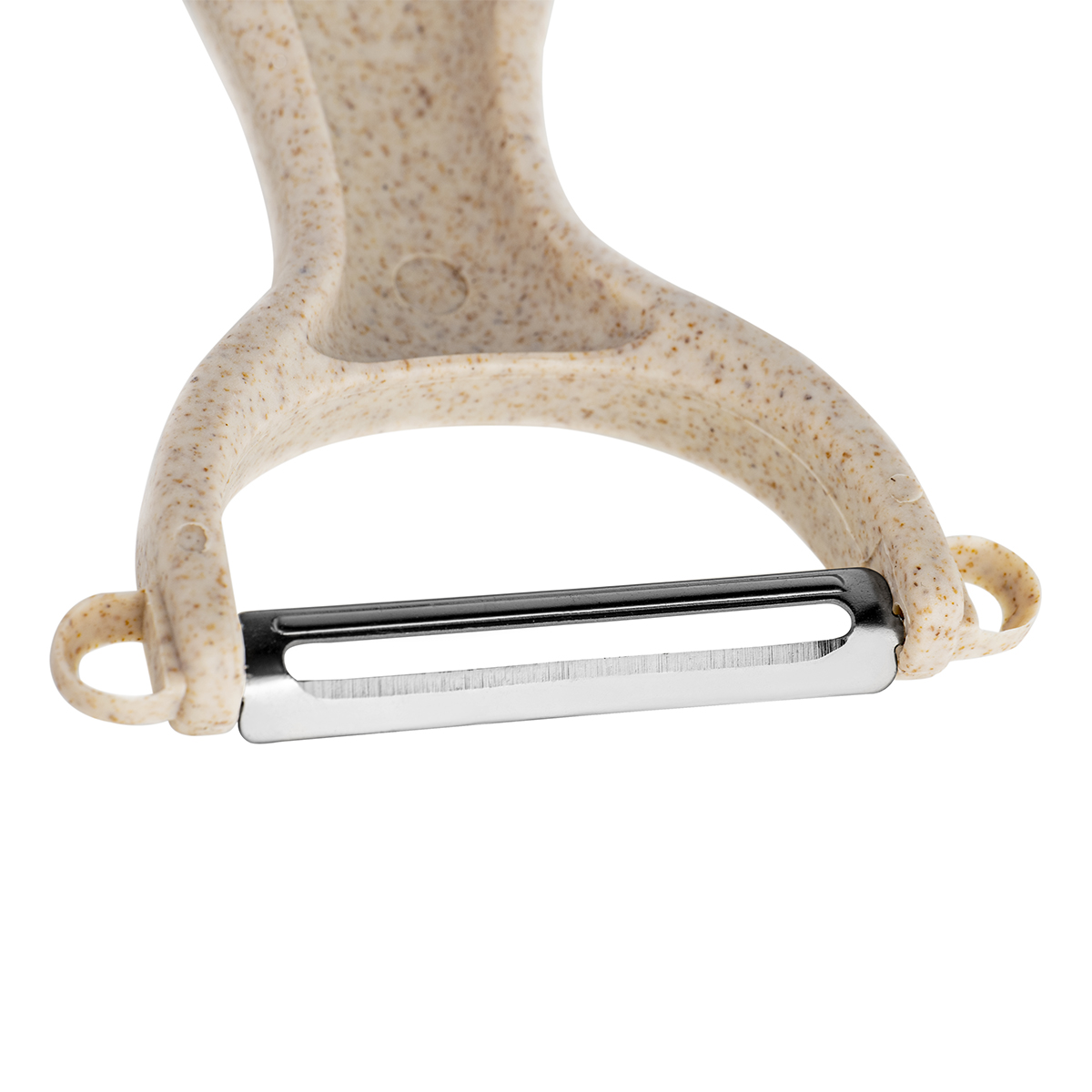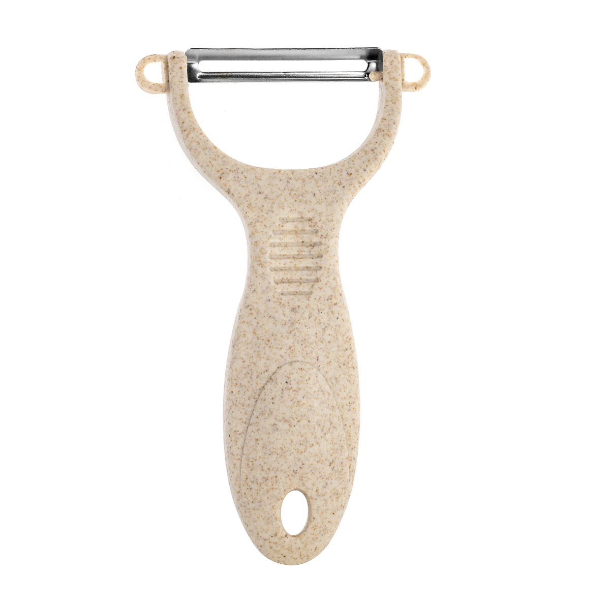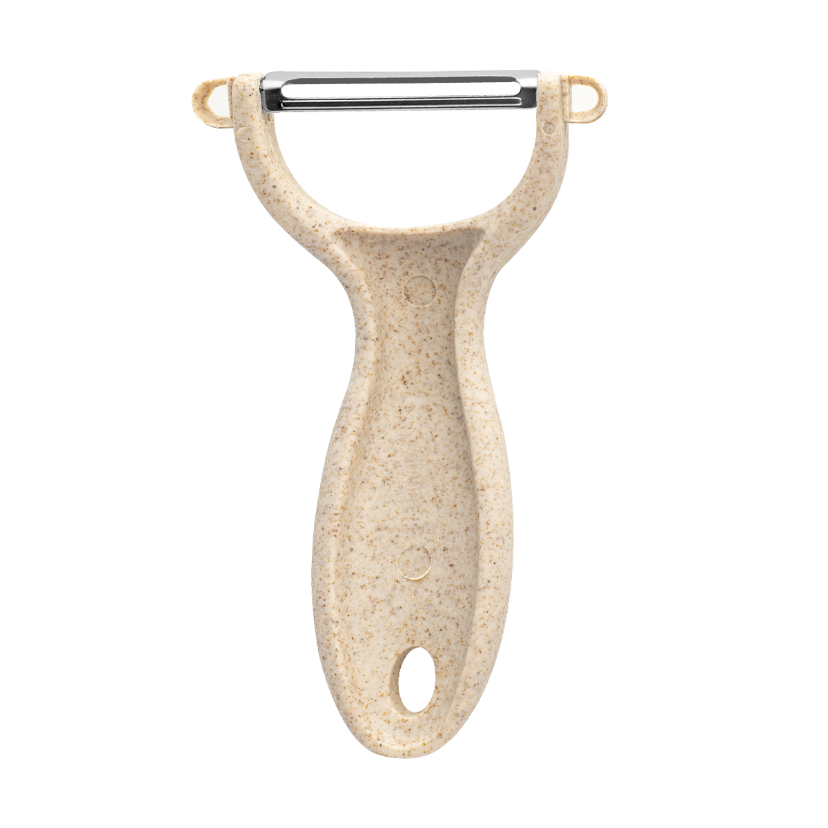 Горизонтальная овощечистка необходима для очистки от кожуры мягких внутри продуктов, таких как цитрусовые, помидоры, киви. Обоюдоострое плавающее лезвие мягко огибает контуры продукта. Лезвие из нержавеющей стали с повышенной влагостойкостью. По бокам есть ушки для вырезания глазков. Имеется отверстие для подвешивания. Материал рукоятки овощечистки содержит рисовую шелуху. Приобретая данное изделие, вы вносите вклад в снижение потребления пластика.