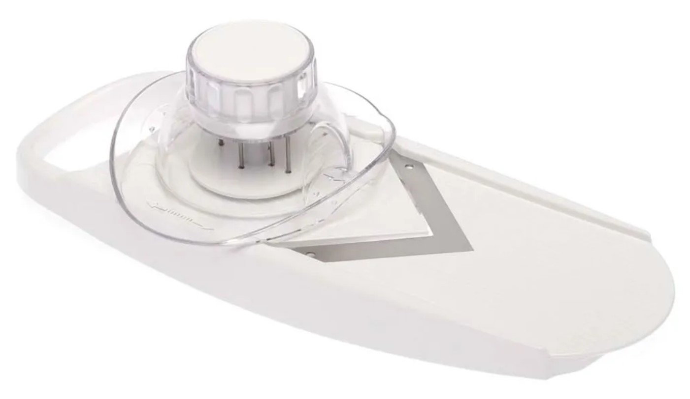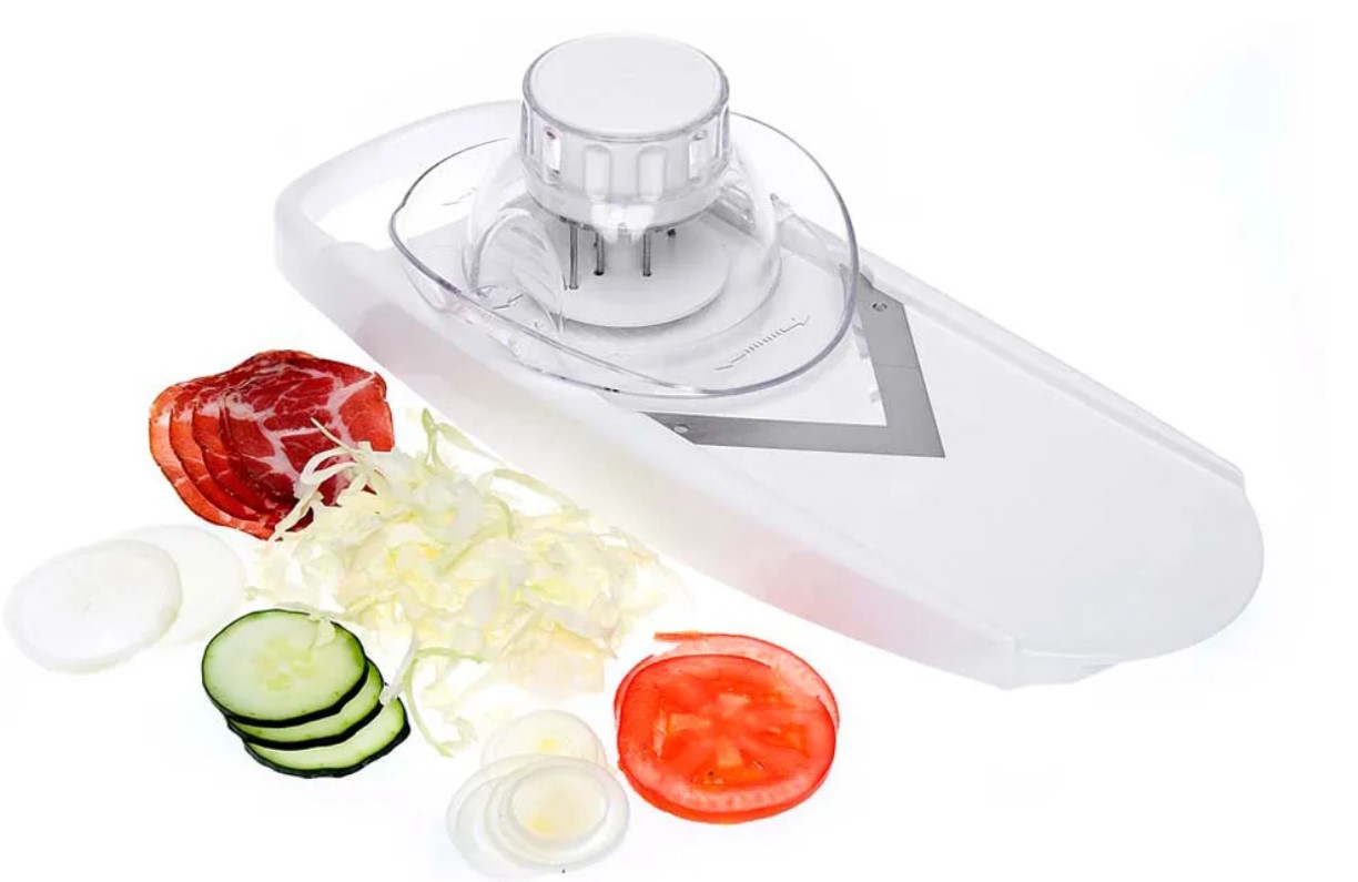 Овощерезка Status 115010 идеально подходит для нарезки всех видов овощей и фруктов, сыра (пармезан и моцарелла), плотных видов хлеба (ржаной) и мясных продуктов (колбасы, ветчина). V-образная форма ножа. Имеет регулировку толщины реза (до 6 мм). Оснащена замком безопасности.