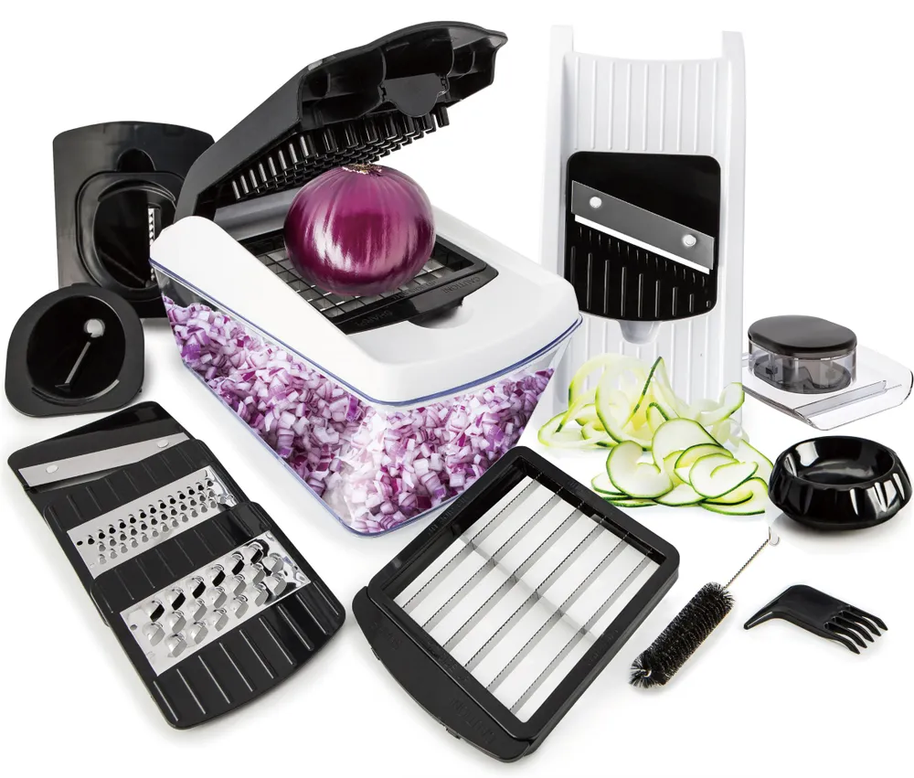 Многофункциональная ручная овощерезка 8 в 1 станет вашей незаменимой помощницей на кухне, которая позволит сэкономить время и силы в процессе приготовления! Её использование поможет быстро и качественно нашинковать овощи и фрукты разнообразными способами: соломкой, кубиками, слайсами. В комплекте 8 насадок: для крупной и мелкой нарезки, терка двух видов для идеальной соломки, терка для чеснока (можно использовать для цедры лимона или апельсина), острые лезвия для фигурной нарезки спиралями и лентами. Преимуществом является удобный пластиковый контейнер для сбора шинкованных овощей и фруктов, которые не будут разлетаться по всей кухне. Кроме этого, в комплекте есть держатель для овощей и фруктов. В процессе готовки можно использовать специальную насадку, которая защитит ваши руки от случайных порезов. Компактная, легко моется, облегчает процесс приготовления и позволяет получить эстетически красивое блюдо.