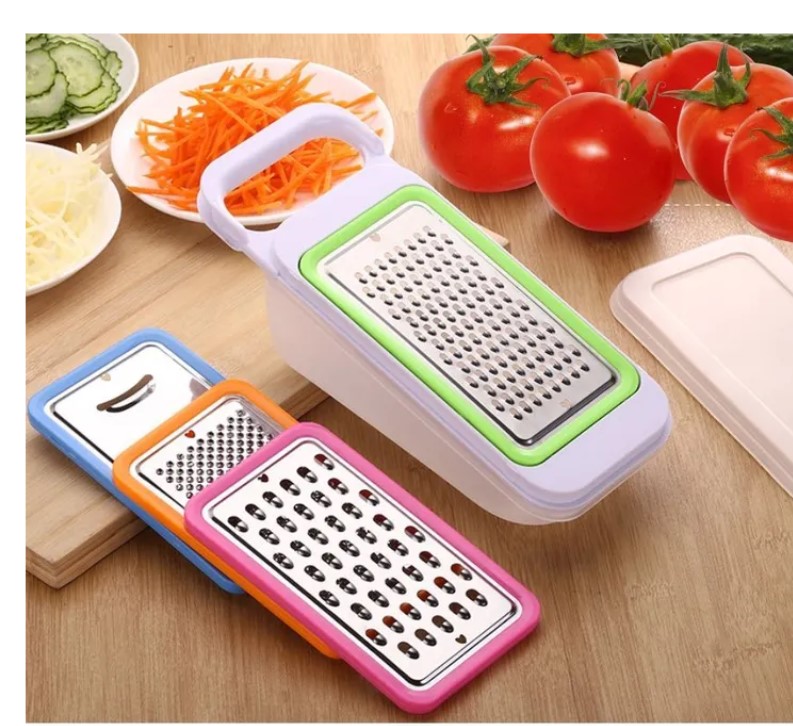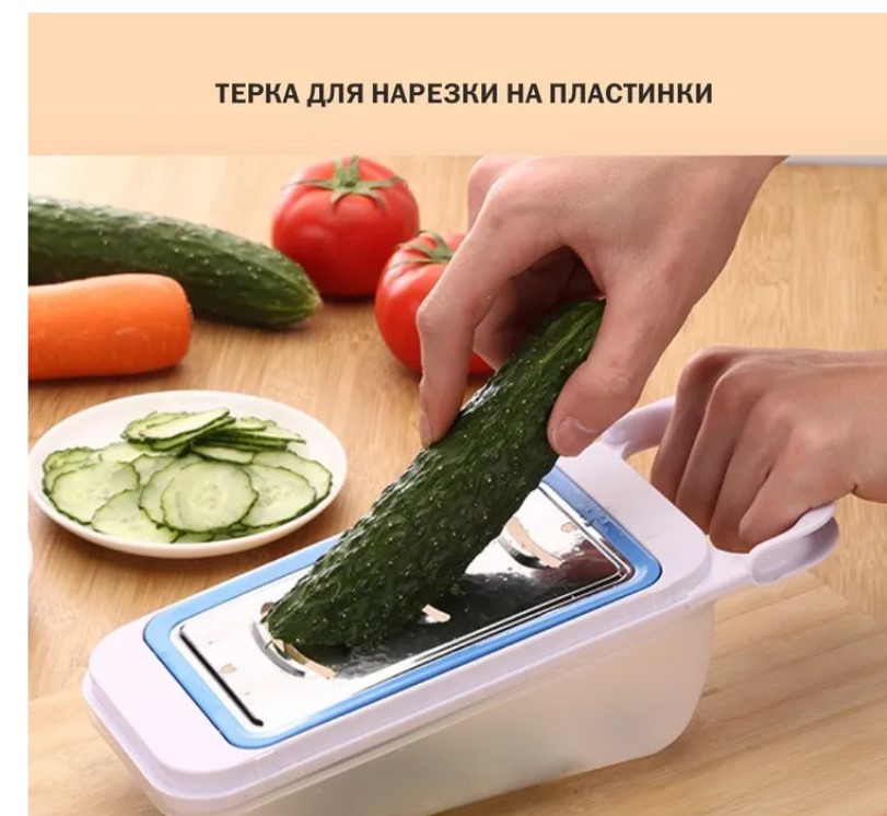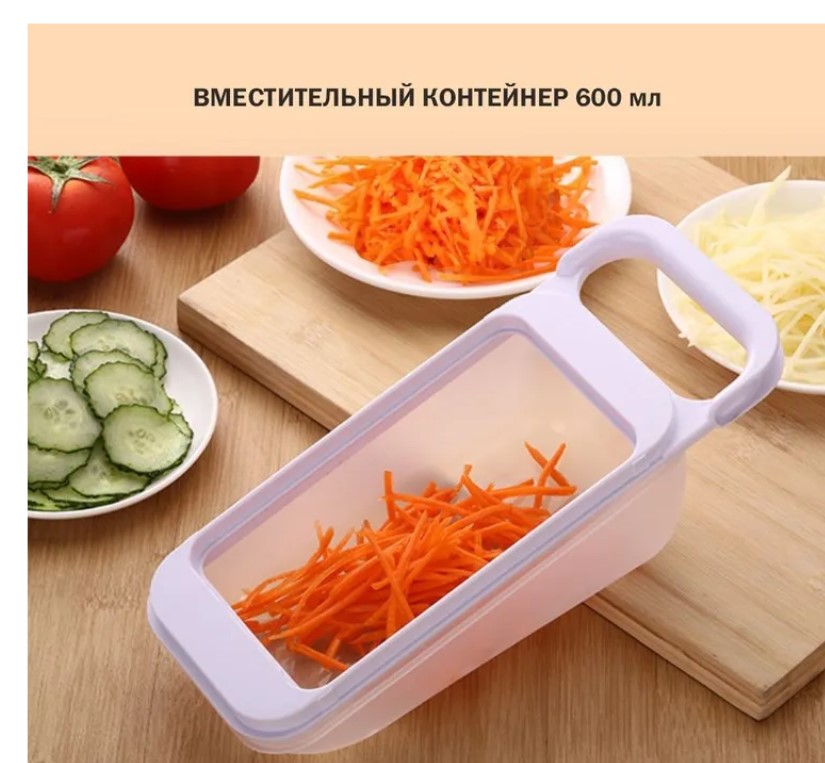Набор состоит из контейнера и 4-х тёрок - для овощей, сыра, чеснока и моркови. Ножи сделаны из нержавеющей стали, пластиковые части из пищевого полипропилена. Ножи тёрок острые и долговечные. Обратите внимание, для вашего удобства у каждой тёрки разные цвета. Желтая тёрка для для твердых продуктов, например, натирания твердого сыра на мелкие кусочки, измельчения корицы, а также для снятия цедры цитрусовых. Зеленая терка для мелкой нарезки овощей. Синяя терка для нарезки на пластинки картофеля, баклажанов, цуккини и кабачков и т.д. Розовая терка для крупной нарезки. Острые лезвия без труда позволят нарезать морковь для салата, картошку для драников или картофельные чипсы. Нашему набору тёрок под силу любые овощи и фрукты, сыры, орехи, шоколад. Можно шинковать капусту, натереть свеклу, кабачок, яблоко, чеснок, имбирь. И мы чуть не забыли про контейнер. Удобный пластиковый контейнер 600 мл в который попадет всё, что вы натрете, нарежете, нашинкуете, поможет сохранить чистоту и порядок на вашей кухне. После этого можно убрать терки в контейнер с крышкой. Удобная вещь в поездках, не займет много места, но позволяет готовить салаты, где бы вы не были. Важно! Использовать тёрки-овощерезки нужно с большой осторожностью, не касайтесь лезвий руками и конечно не давайте тёрки в руки детям. После работы прополощите рабочую тёрку в теплой водой. Во время мытья не касайтесь ножей руками, используйте щетку. Не вытирайте тёрку. Мокрую тёрку сушите в недоступном для детей месте. Не мойте тёрки в посудомоечной машине.